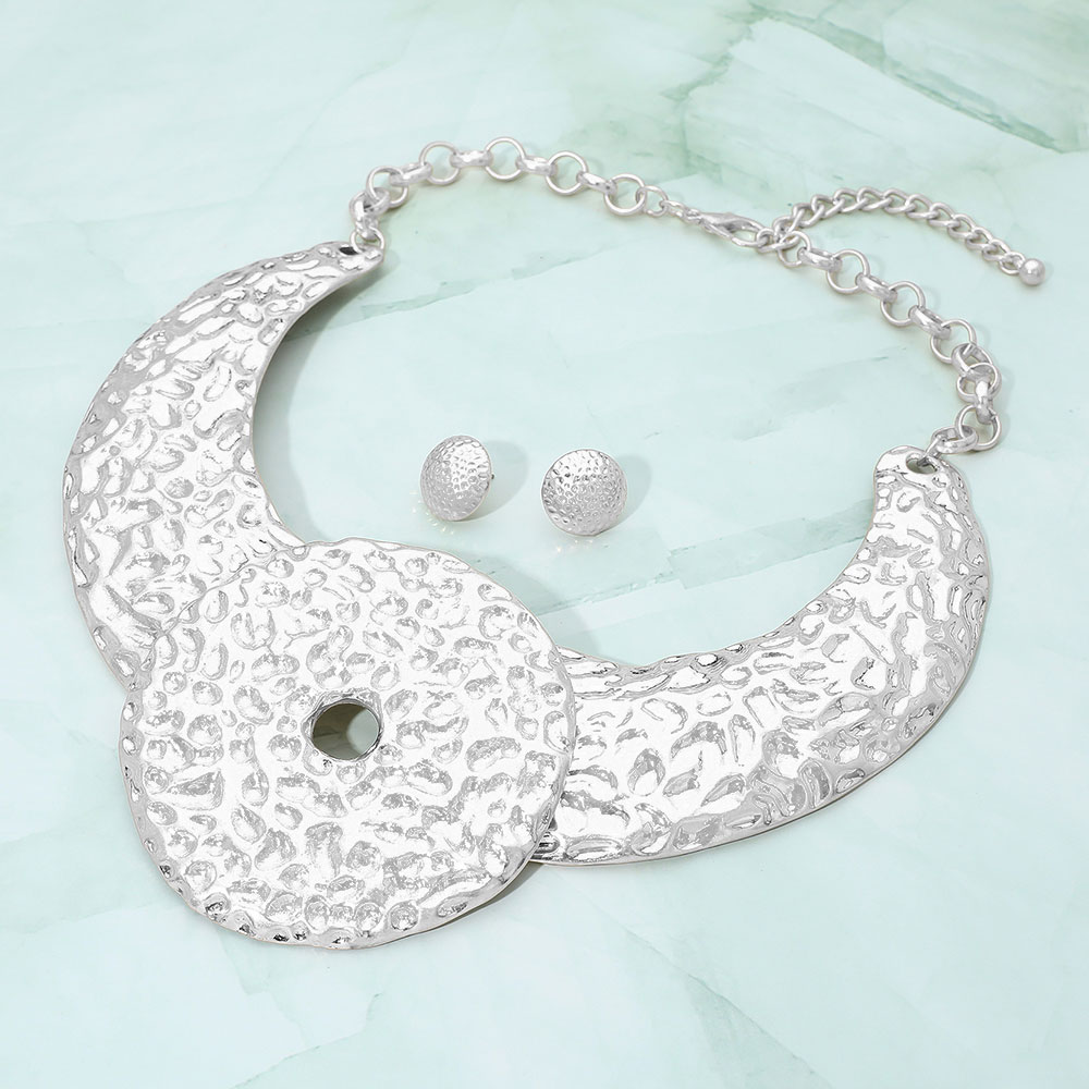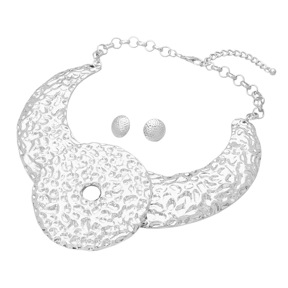 Details • Necklace Size : 19" + 3" L • Decor Size : 3.5" L • Earrings Size : 0.7" L • Elevate your look with this hammered statement collar necklace and matching earrings. Featuring bold, sculpted textures and a striking circular centerpiece, this set exudes modern elegance—perfect for adding a touch of artistic sophistication to any outfit. • Lead and Nickel Compliant