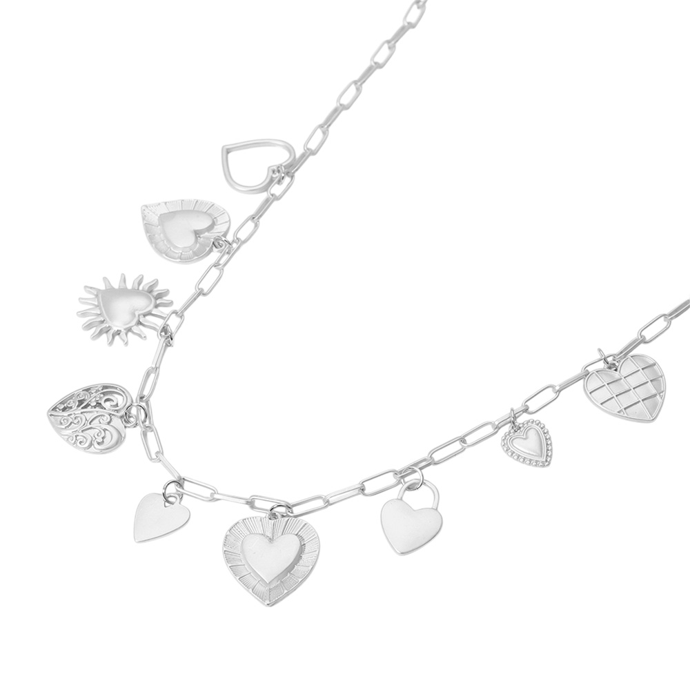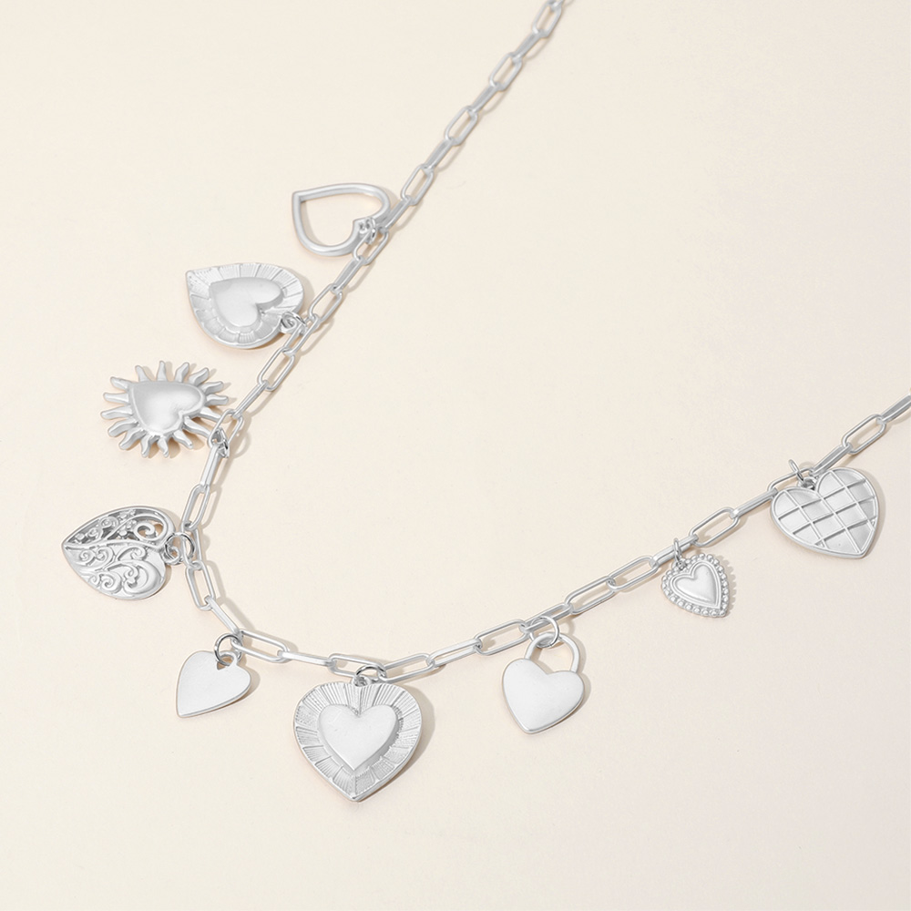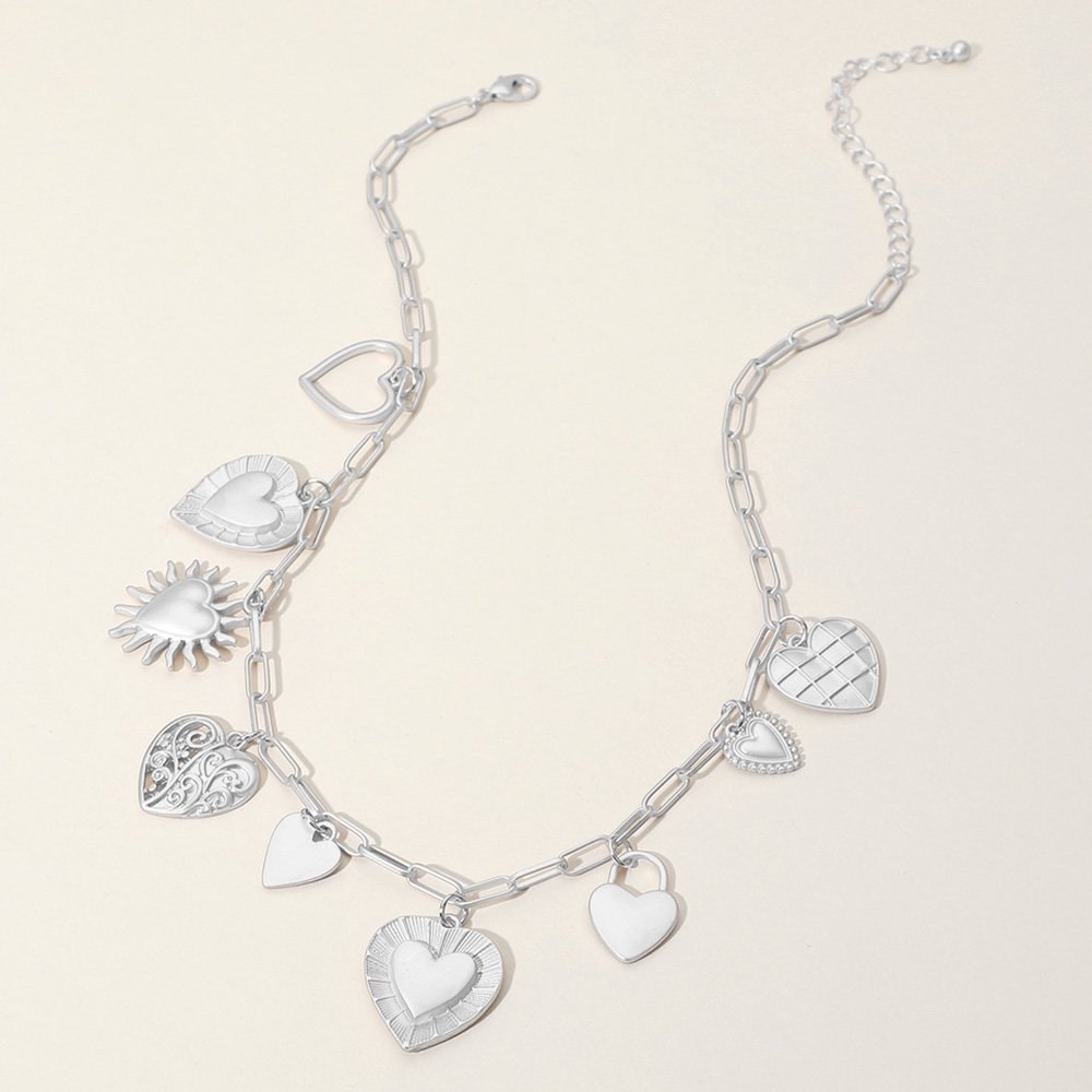 Details • Necklace Size : 16" + 3.25" L • Decor Size : 1.25" L • Stylish charm necklace featuring multiple heart-shaped pendants on a delicate link chain. Perfect for layering or wearing alone to enhance any casual or elegant outfit. • Lead and Nickel Compliant