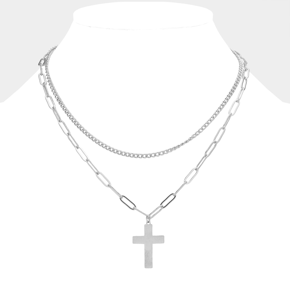 Gold Dipped Stone Paved Cross Pendant Cuban Chain Layered Necklace
