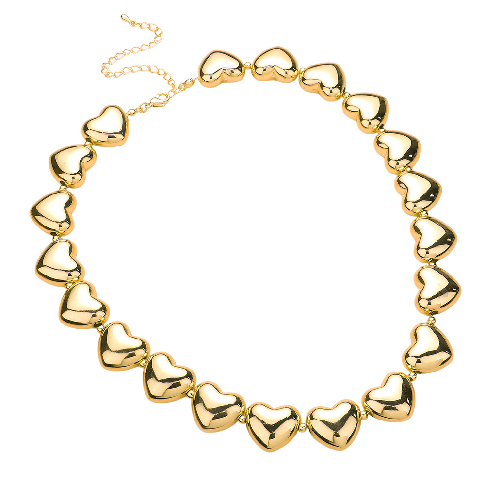 Details • Necklace Size : 16" + 3.25" L • Decor Size : 0.6" L • Eye-catching heart bead statement necklace featuring a full strand of smooth puffed hearts linked together for a bold, romantic look. A standout accessory that adds charm and personality to any outfit, perfect for gifting or elevating everyday style. • Lead and Nickel Compliant