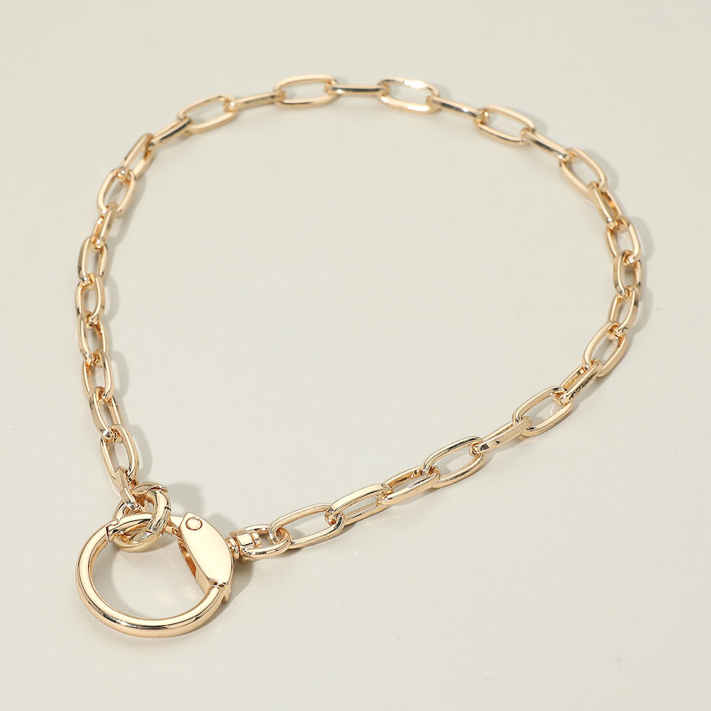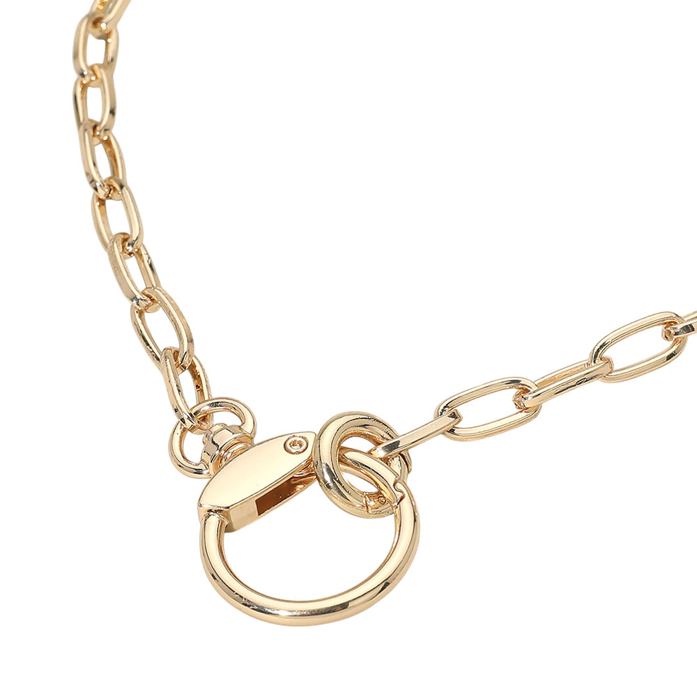 Details • Necklace Size : 17" + 0.5" L • Decor Size : 1.2" L • This ring clasp link chain necklace features a bold interlocking design with a functional statement closure that doubles as a focal detail. The modern chain silhouette offers versatile styling for layering or solo wear, making it ideal for everyday looks, trend-focused collections, and gift-ready jewelry assortments. • Lead and Nickel Compliant