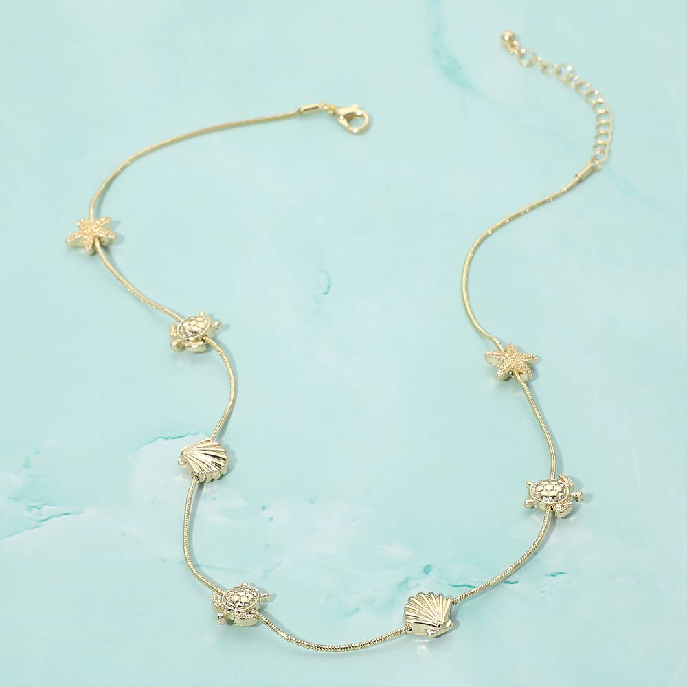 • This sea life charm necklace features a slender chain adorned with ocean-inspired icons that add subtle movement and charm. Designed for effortless layering or solo wear, it offers a relaxed yet refined accent ideal for everyday outfits, resort styling, gift shops, and coastal-themed jewelry collections.
