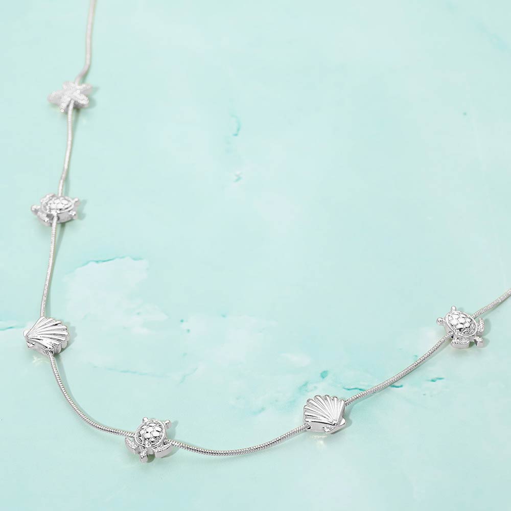 • This sea life charm necklace features a slender chain adorned with ocean-inspired icons that add subtle movement and charm. Designed for effortless layering or solo wear, it offers a relaxed yet refined accent ideal for everyday outfits, resort styling, gift shops, and coastal-themed jewelry collections.
