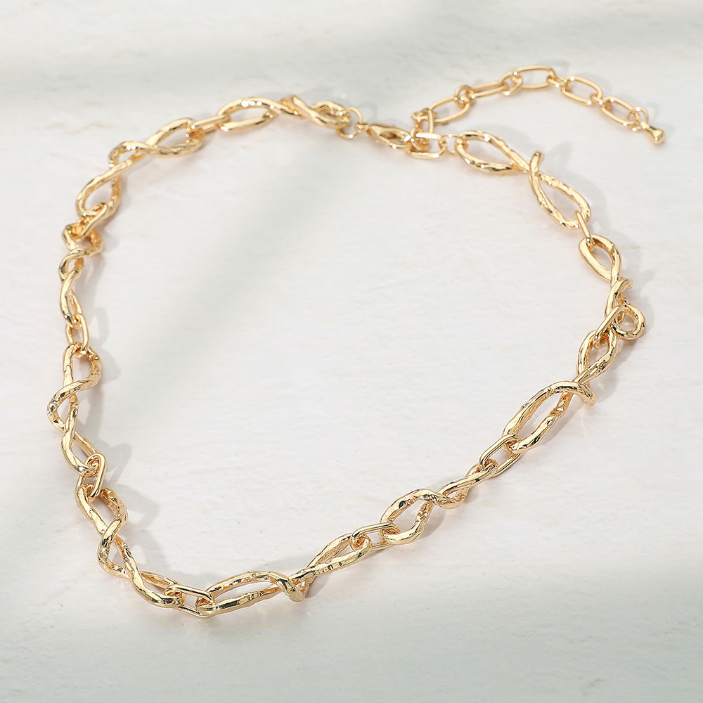Details • Necklace Size : 15.5" + 3" L • Decor Size : 0.4" L • Add modern edge to your look with this twisted irregular chain necklace featuring unique textured links and a polished finish. Designed with an adjustable closure for a custom fit, this versatile piece is perfect for layering or wearing solo, making it an ideal statement for everyday style. • Lead and Nickel Compliant