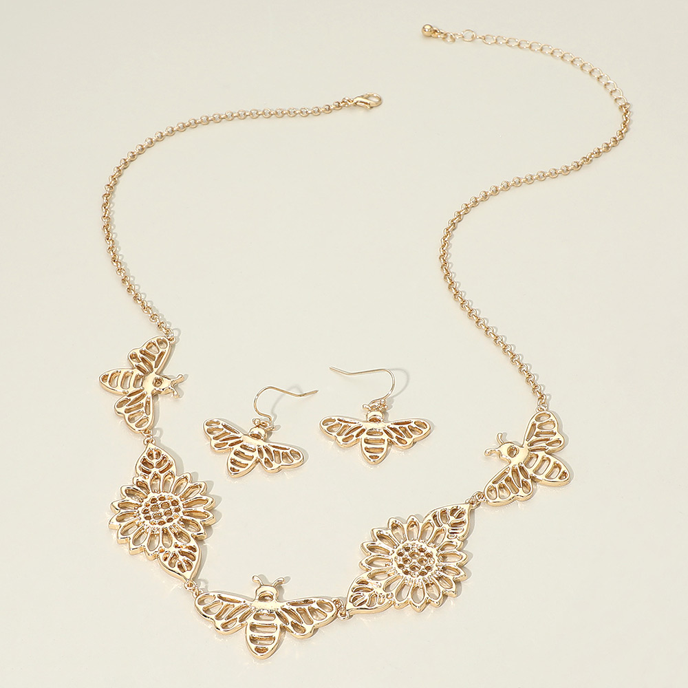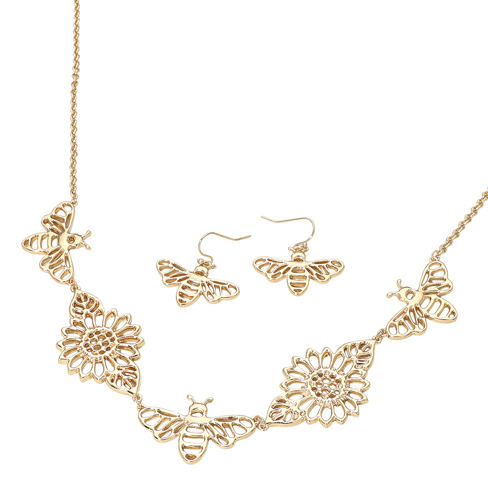 Details • Necklace Size : 22" + 3" L • Decor Size : 1.1" L • Earrings Size : 1.1" L • This bumble bee and floral necklace and earring set showcases openwork butterfly accents paired with detailed flower motifs for a graceful, nature-inspired design. Easy to style together or separately, it suits everyday wear, gifting, boutiques, and seasonal collections, offering a delicate statement with versatile appeal. • Lead and Nickel Compliant