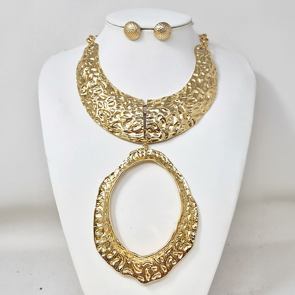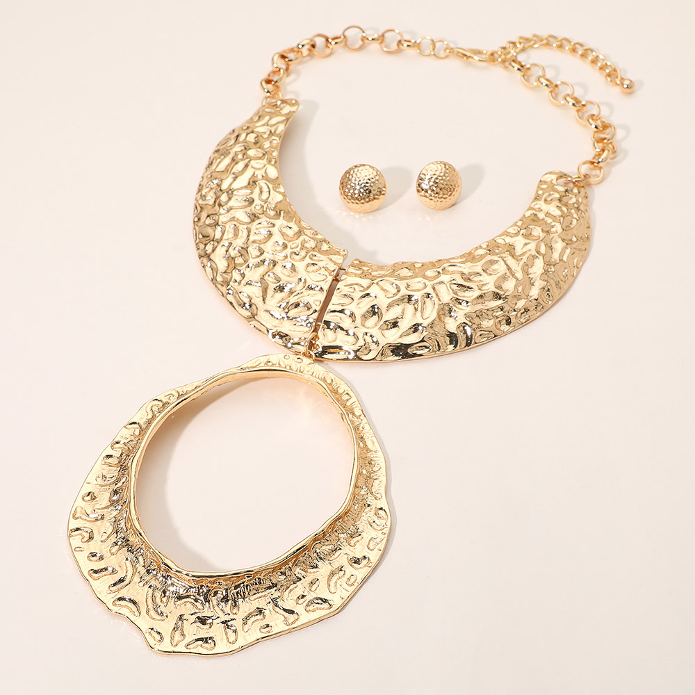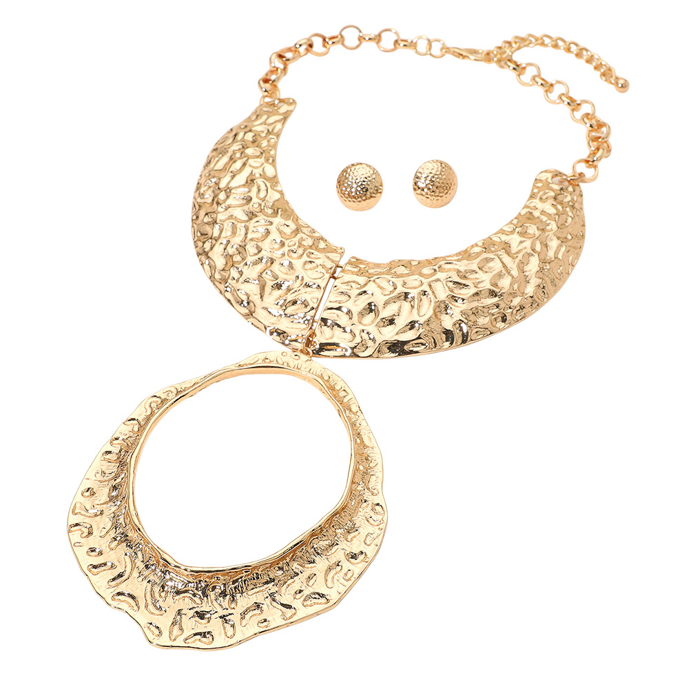 Details • Necklace Size : 16" + 3" L • Decor Size : 6.5" L • Earrings Size : 0.6" L • This textured jewelry set includes a bold necklace, matching bracelet, and stud earrings designed to make a striking impression. With its sculptural detailing and refined finish, it adds an elegant, artistic touch that transforms any outfit into a statement look. • Lead and Nickel Compliant