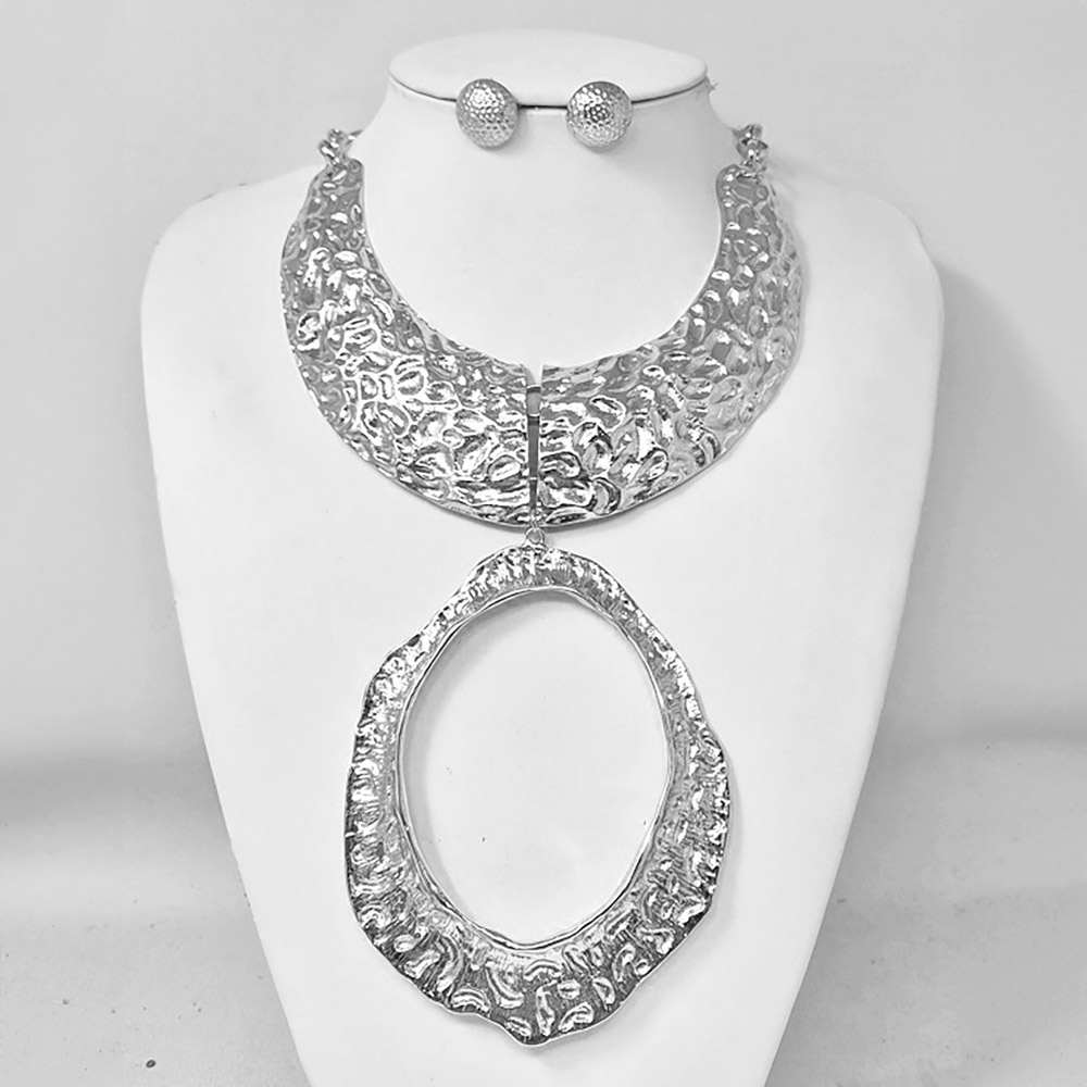 Details • Necklace Size : 16" + 3" L • Decor Size : 6.5" L • Earrings Size : 0.6" L • This textured jewelry set includes a bold necklace, matching bracelet, and stud earrings designed to make a striking impression. With its sculptural detailing and refined finish, it adds an elegant, artistic touch that transforms any outfit into a statement look. • Lead and Nickel Compliant