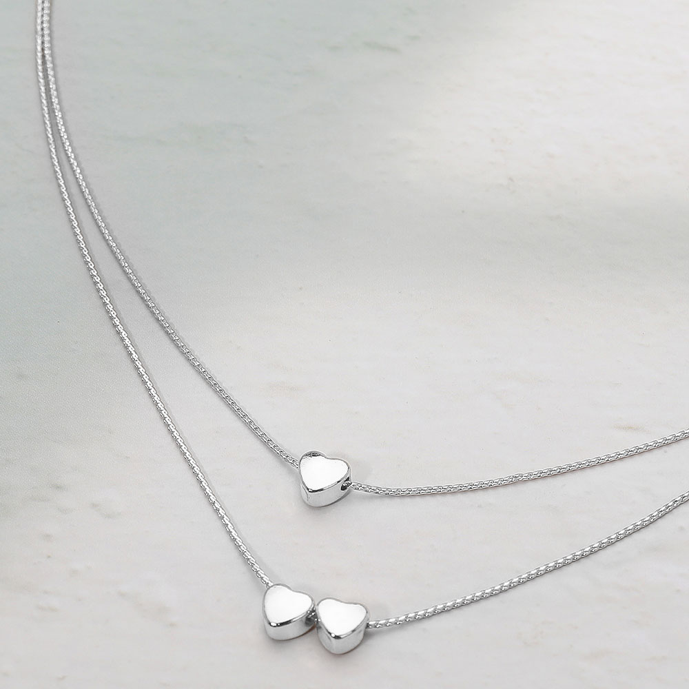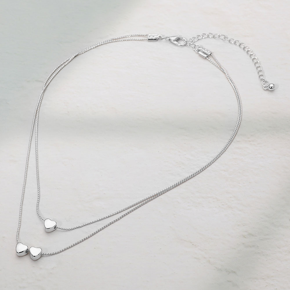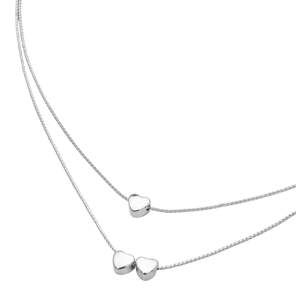 Details • Necklace Size : 14.5" + 3.25" L • Decor Size : 0.8" L • Elegant layered heart necklace featuring dual chains with petite heart charms for a delicate, romantic look. Perfect for everyday elegance or special occasions, this dainty design adds a touch of charm and love-inspired sophistication to any outfit. • Lead and Nickel Compliant