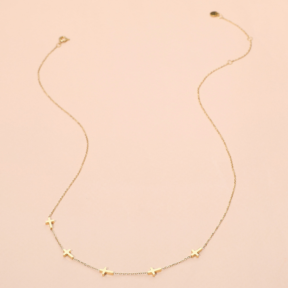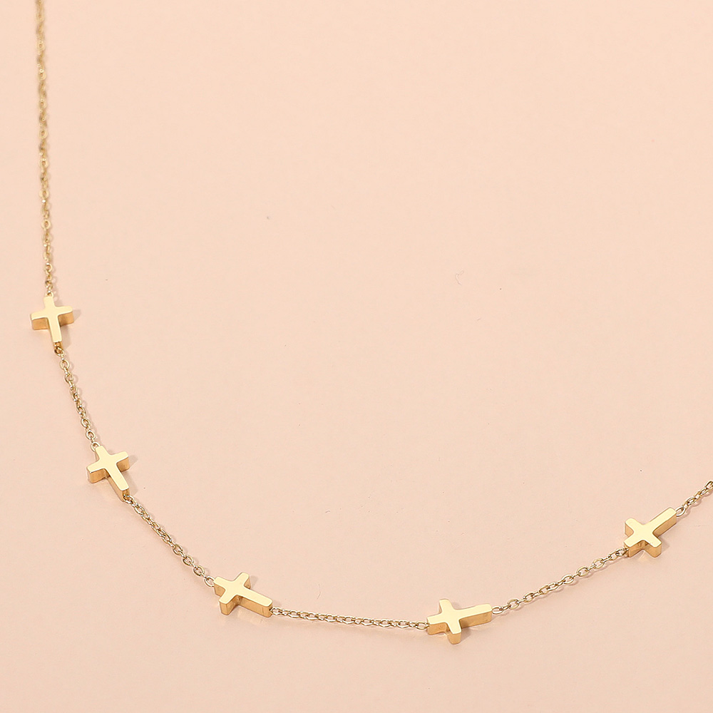 Details • Necklace Size : 16" + 2.5" L • Decor Size : 0.2" L • This dainty chain necklace features multiple cross accents delicately spaced along its length, blending timeless symbolism with modern elegance. A versatile piece for layering or wearing solo, it adds a subtle yet meaningful touch to both casual and dressy looks. • Stainless Steel