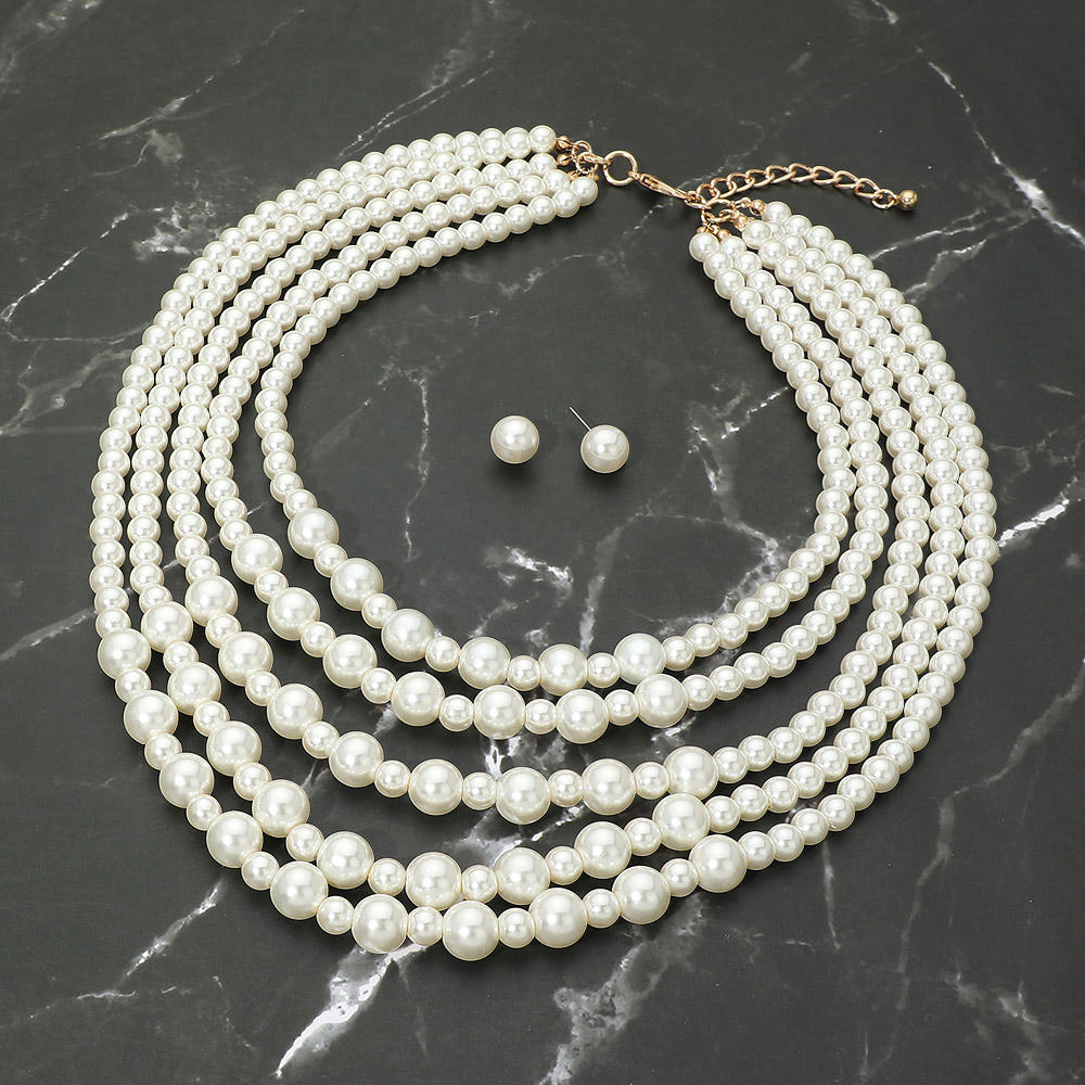 Details • Necklace Size : 19" + 3" L • Decor Size : 5" L • Earrings Size : 0.4" L • Elegant multi strand beaded necklace set designed for timeless styling and effortless layering. Features graduated strands with matching stud accents and an adjustable closure for versatile wear. Ideal for weddings, formal events, office looks, or elevating everyday outfits with a refined, classic statement. • Lead and Nickel Compliant