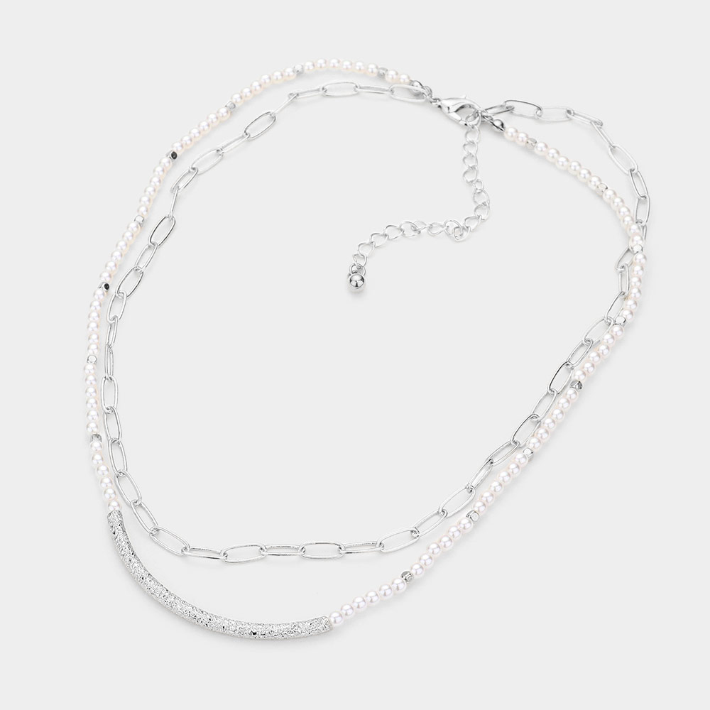 Curved Metal Tube Accented Pearl Open Oval Link Double Layered Necklace