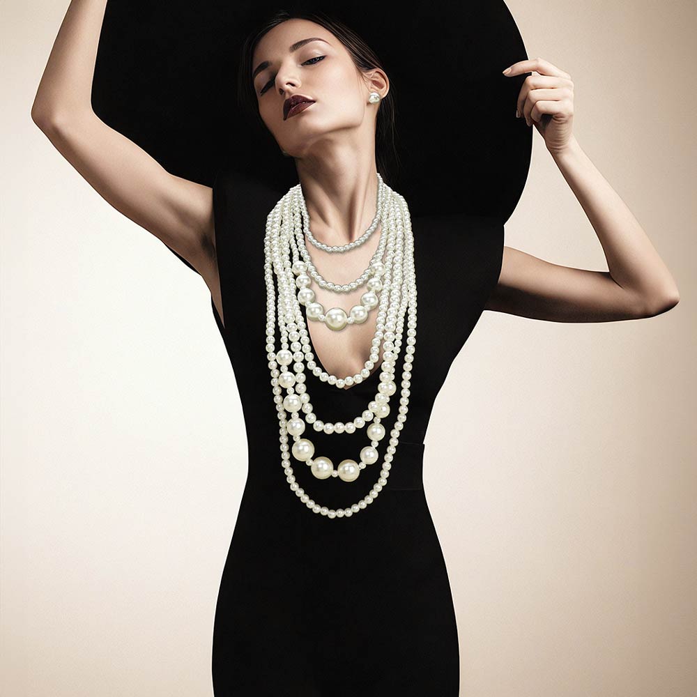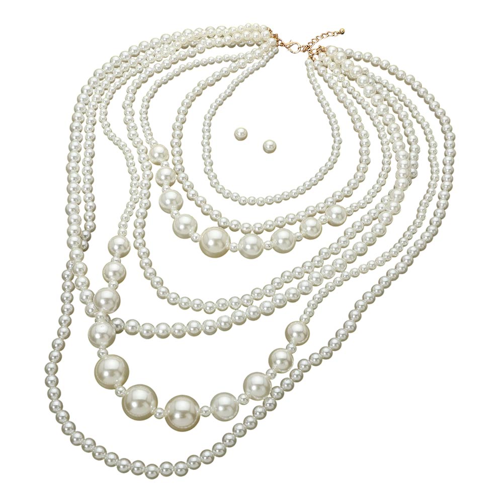Details • Necklace Size : 20" + 2.75" L • Decor Size : 1.3" L • Earrings Size : 0.4" L • Elegant layered necklace set designed with multiple pearl strands and graduated bead accents for depth and movement. Drapes beautifully to create a timeless statement look and includes matching stud earrings for effortless coordination. Ideal for formal occasions, bridal styling, or boutiques seeking classic, sophisticated jewelry sets. • Lead and Nickel Compliant