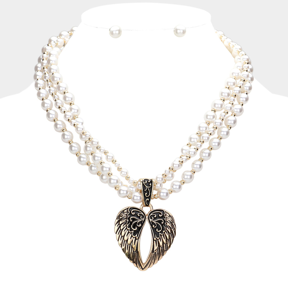 Details • Necklace Size : 18" + 3" L • Pendant Size : 1.6" X 2.25" • Earring Size : 0.25" L • Elevate your style with a layered pearl bead necklace featuring an angel wing heart pendant, symbolizing love and protection. Perfect for daily wear or special occasions. • Lead and Nickel Compliant
