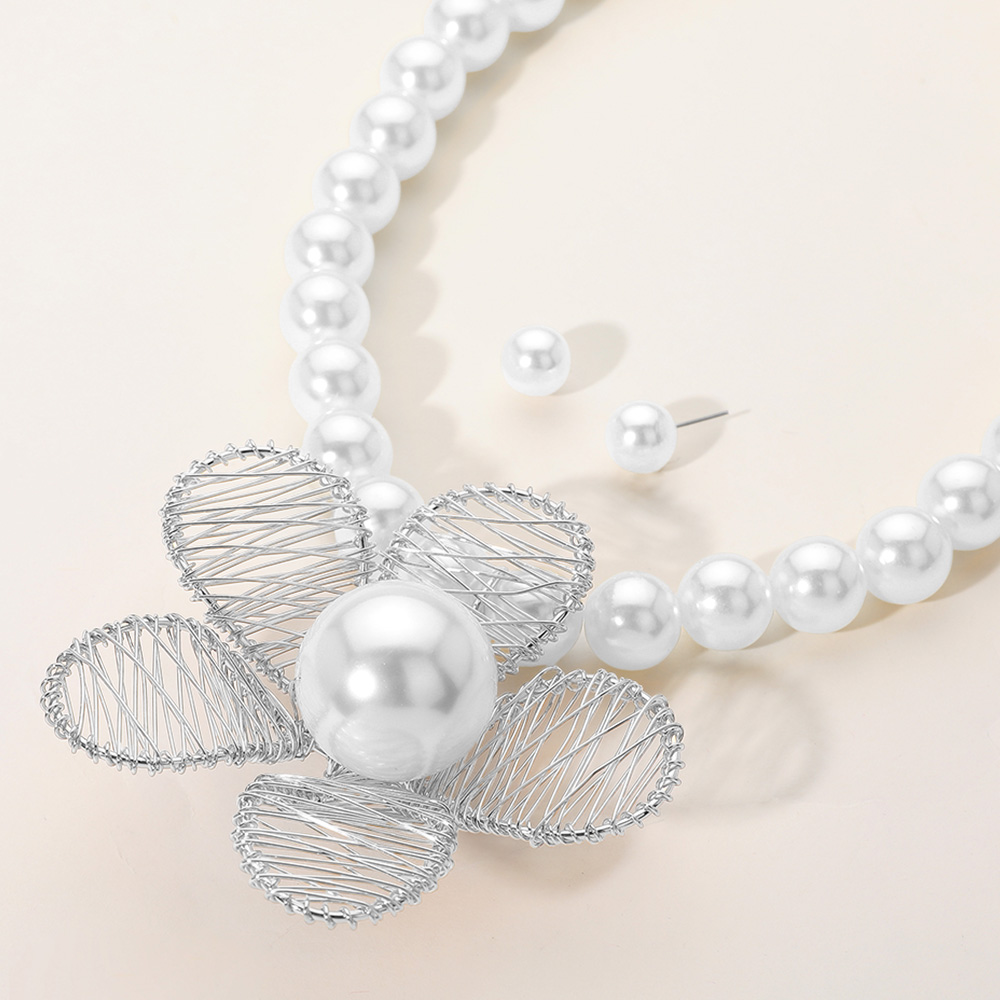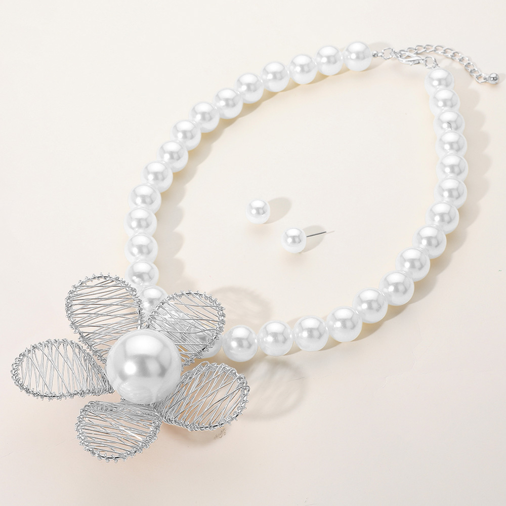 Metal Wire Petal Flower Pointed Pearl Statement Necklace