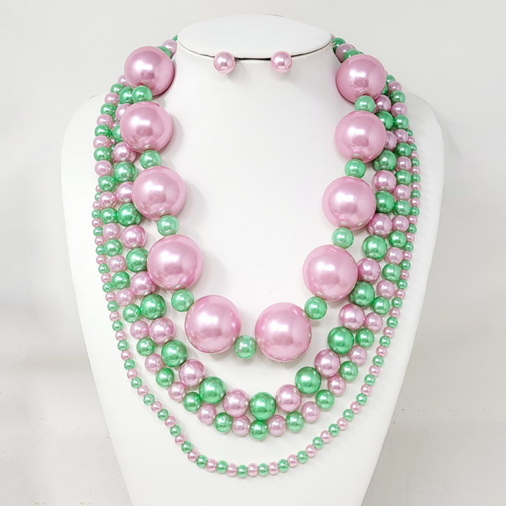 Details • Necklace Size : 21.5" + 3.25" L • Decor Size : 3" L • Earrings Size : 0.4" L • Elegant multi-layered necklace set featuring bold pearl-like beads in alternating sizes, paired with classic stud earrings. Perfect for formal events, evening parties, or special occasions, this statement piece adds a touch of sophistication and drama to any look with its striking layered design. • Lead and Nickel Compliant
