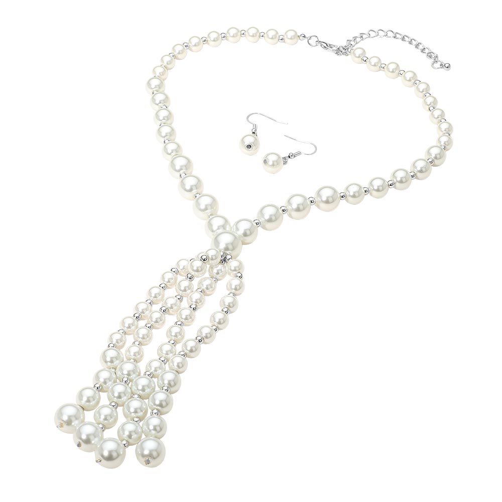 • Elegant bead necklace and earring set featuring graduated pearl-style beads and a cascading tassel centerpiece for a refined, statement look. Perfect for dressing up special occasions or adding a polished touch to everyday outfits. A coordinated set that offers timeless charm and sophisticated style.