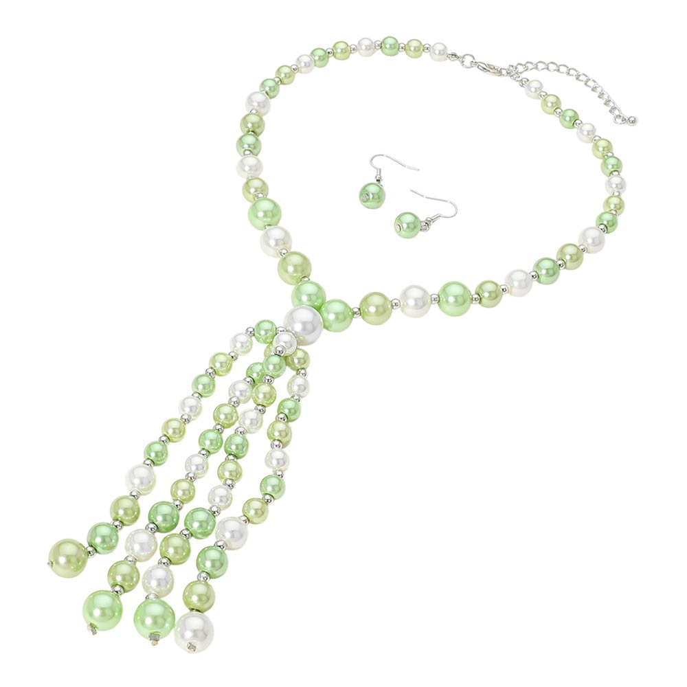 • Elegant bead necklace and earring set featuring graduated pearl-style beads and a cascading tassel centerpiece for a refined, statement look. Perfect for dressing up special occasions or adding a polished touch to everyday outfits. A coordinated set that offers timeless charm and sophisticated style.