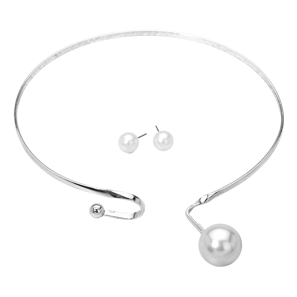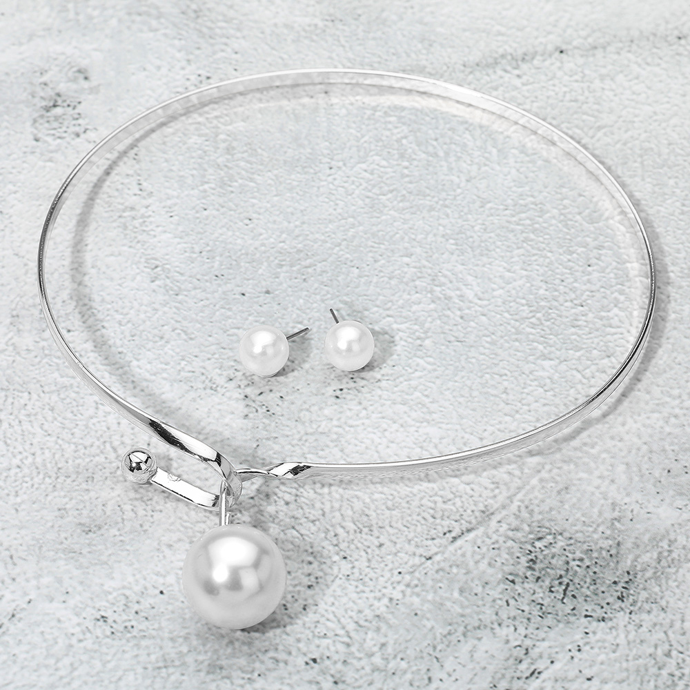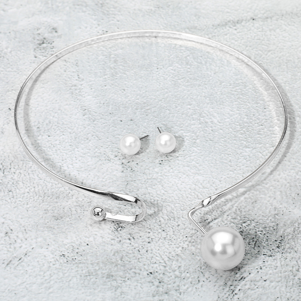 • Minimalist open choker necklace featuring a sleek band accented with round pearl ends, paired with classic stud earrings for a timeless look. Perfect for layering or wearing solo, this versatile jewelry set adds sophistication and modern elegance to both casual and dressy outfits.
