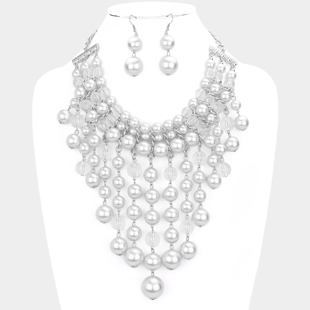 Pearl Lucite Bead Fringe Statement Necklace