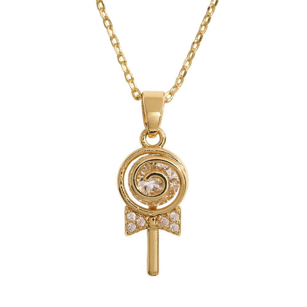 Details • Necklace Size : 16" + 2" L • Pendant Size : 0.6" X 0.8" • Sweet and playful, this lollipop-shaped pendant necklace is adorned with sparkling CZ stones and a charming bow detail. A whimsical yet elegant accessory that adds fun to any outfit, it makes the perfect gift for those who love unique and eye-catching jewelry. • CZ Cubic Zirconia • Gold Dipped • Made In Korea