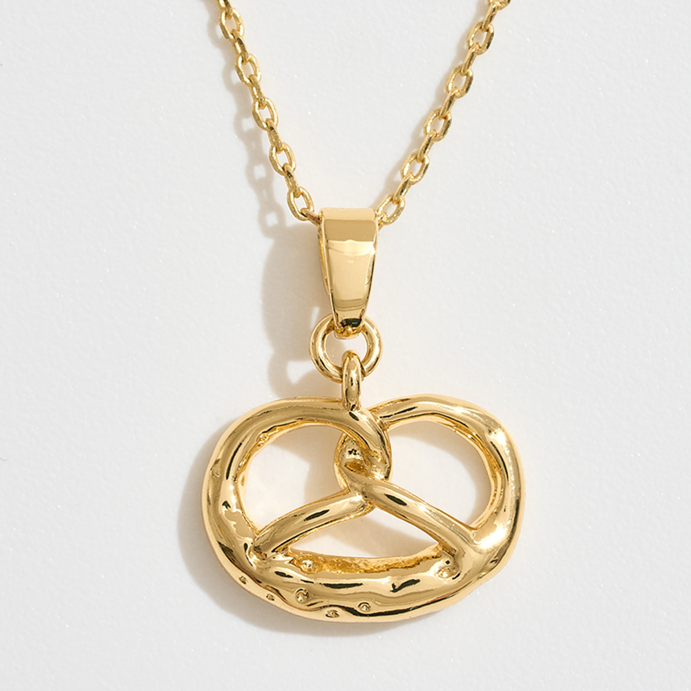 Details • Necklace Size : 16" + 2" L • Pendant Size : 0.7" X 0.75" • Add a playful twist to your jewelry collection with this charming pretzel pendant necklace. Designed with a realistic knot detail, it’s a fun and stylish piece that makes a perfect gift for food lovers, bakers, or anyone who enjoys quirky accessories with a unique touch. • Gold Dipped • Made In Korea