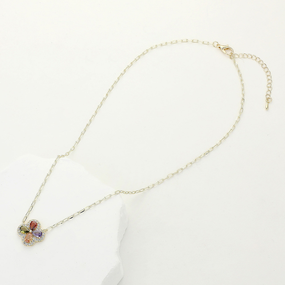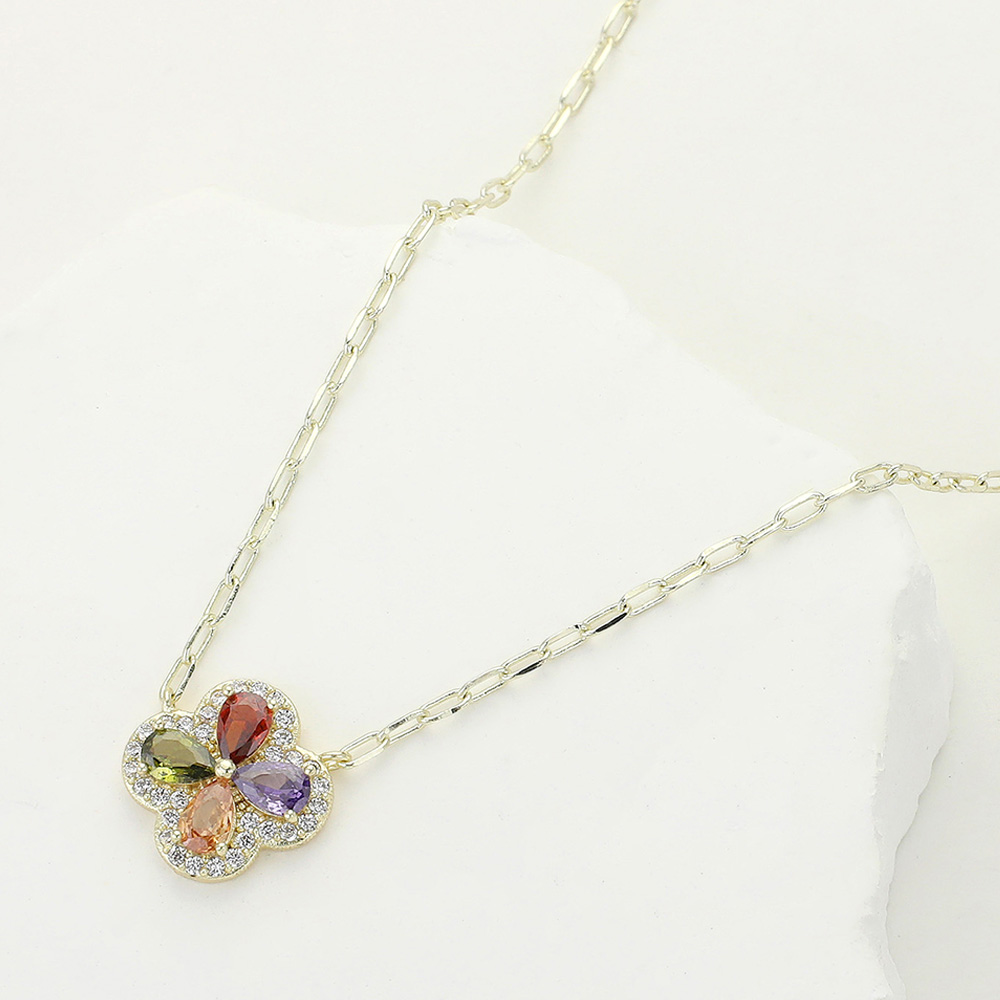 14K Gold Plated Colorful CZ Stone Embellished Quatrefoil Pendant Necklace
