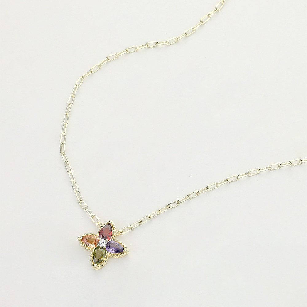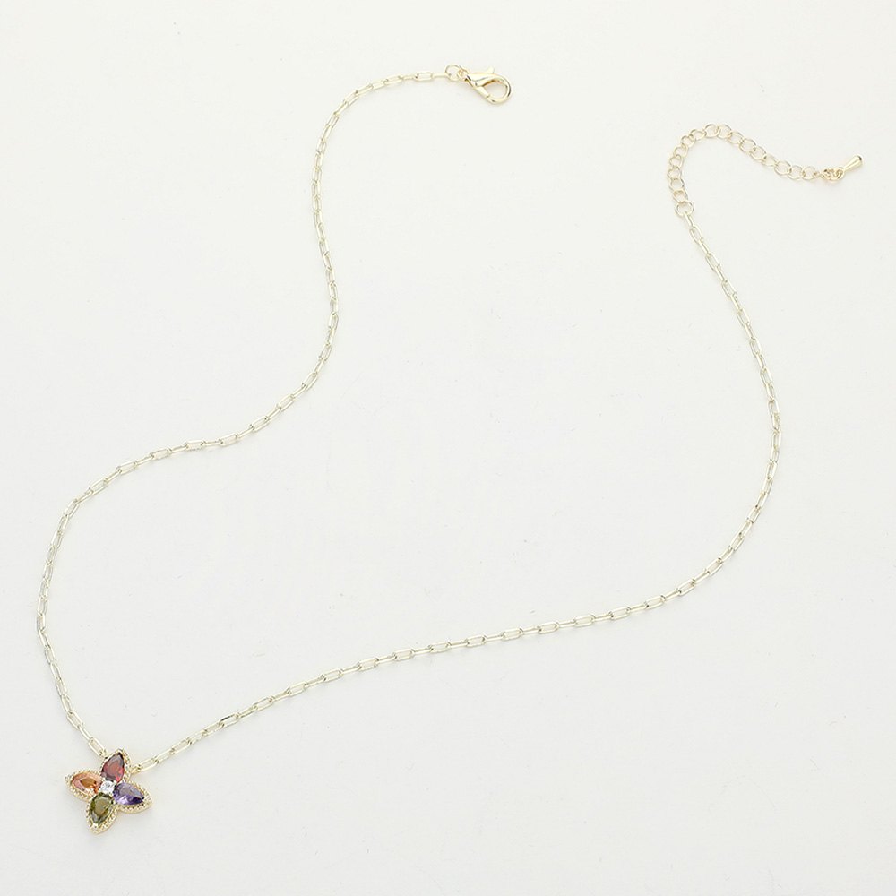 14K Gold Plated CZ Stone Clover Paperclip Chain Pendant Necklace