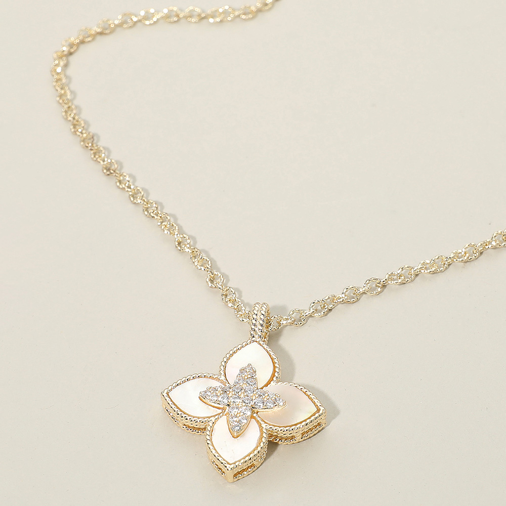 Details • Necklace Size : 17" + 2" L • Pendant Size : 1.25" X 1.5" • This elegant floral pendant necklace features a beautifully detailed petal motif adorned with sparkling crystal accents. Its timeless design and delicate craftsmanship make it perfect for adding a refined touch to both everyday ensembles and special occasions. • CZ Cubic Zirconia • Gold Dipped