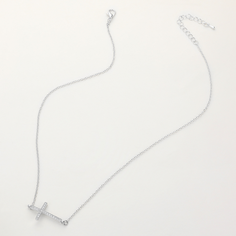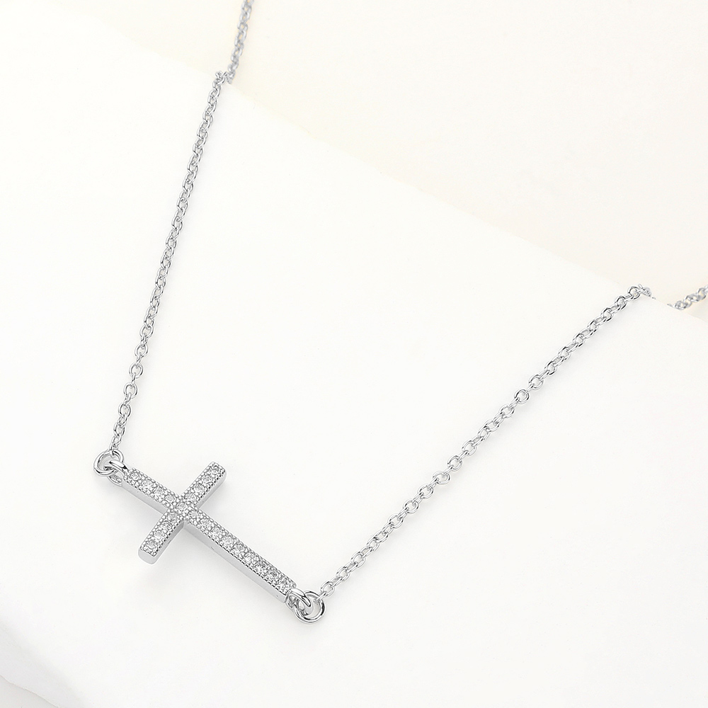 Details • Necklace Size : 17.75" + 2.25" L • Pendant Size : 1" X 0.6" • A chic sideways cross pendant necklace adorned with shimmering details for a modern twist on a timeless design. Perfect for layering or wearing solo, this elegant piece adds meaning and style to any outfit. • Gold Dipped • CZ Cubic Zirconia