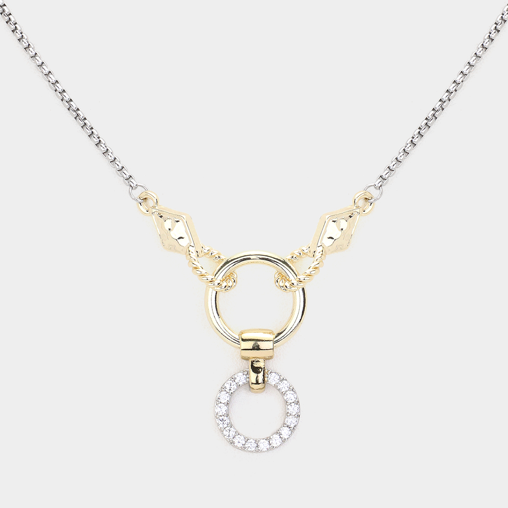 14K Gold Plated Two Tone CZ Stone Paved Open Circle Pendant Necklace