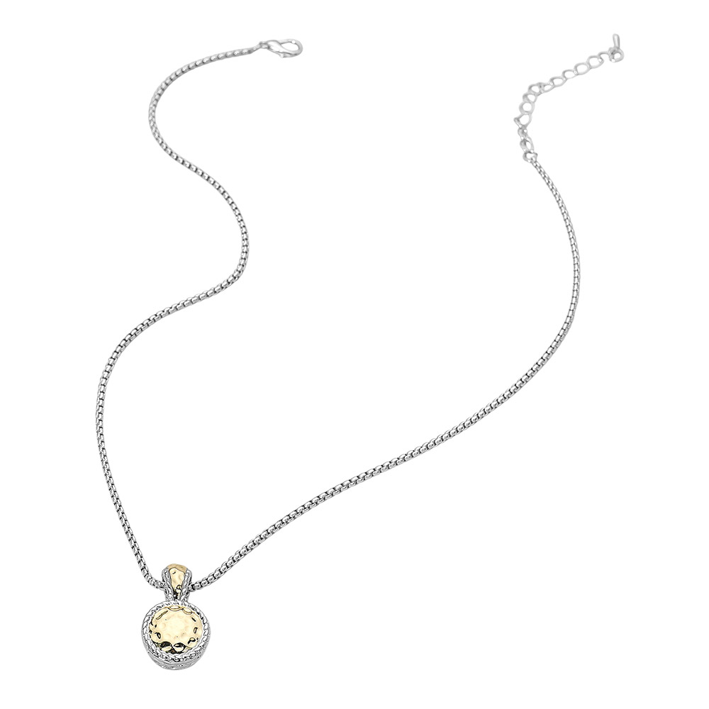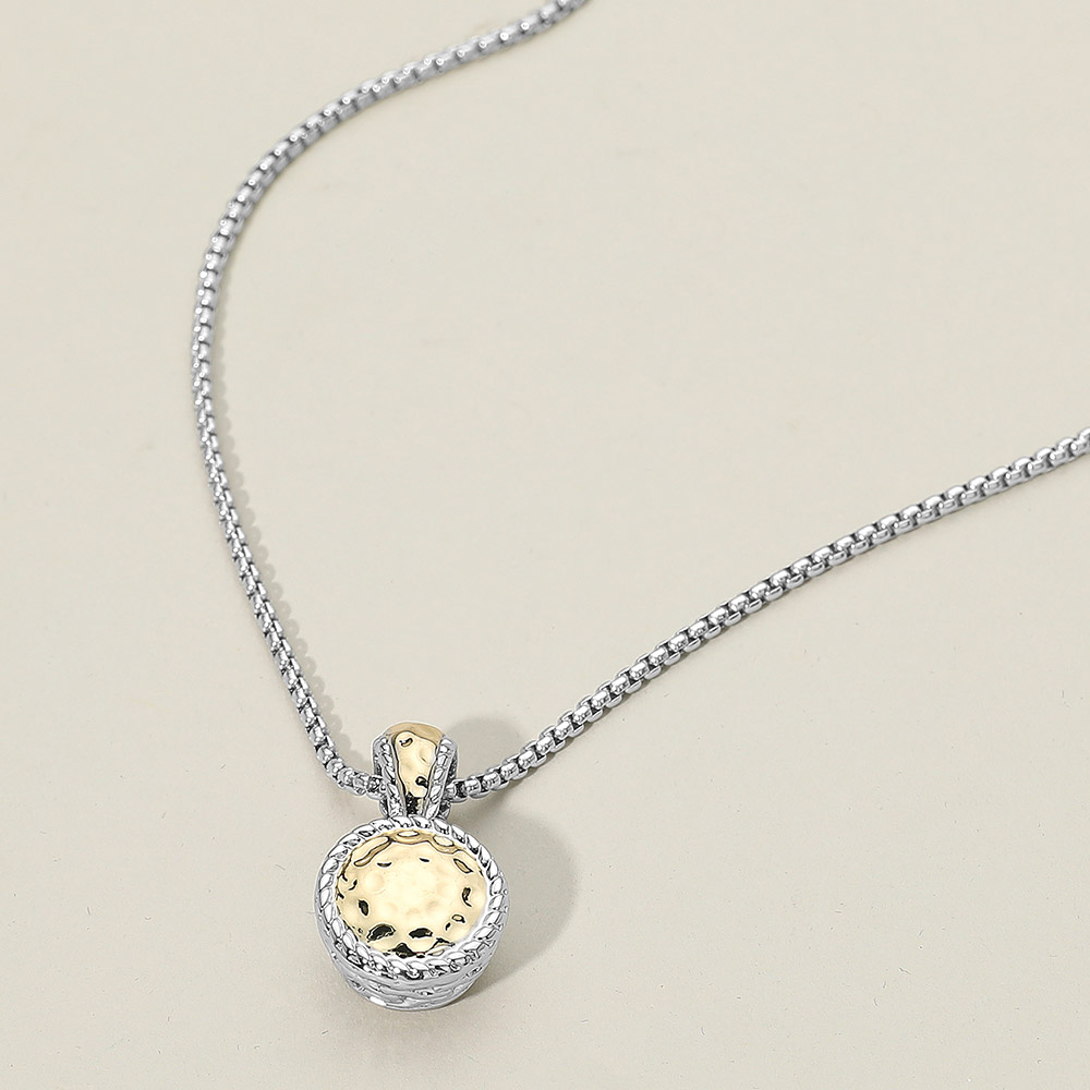 Details • Necklace Size : 16" + 2" L • Pendant Size : 0.6" X 1" • Refined chain necklace featuring a round textured pendant framed with intricate detailing. Lightweight, adjustable, and perfect for everyday wear or layering. A timeless accent that adds subtle sophistication to any outfit. • Gold Dipped