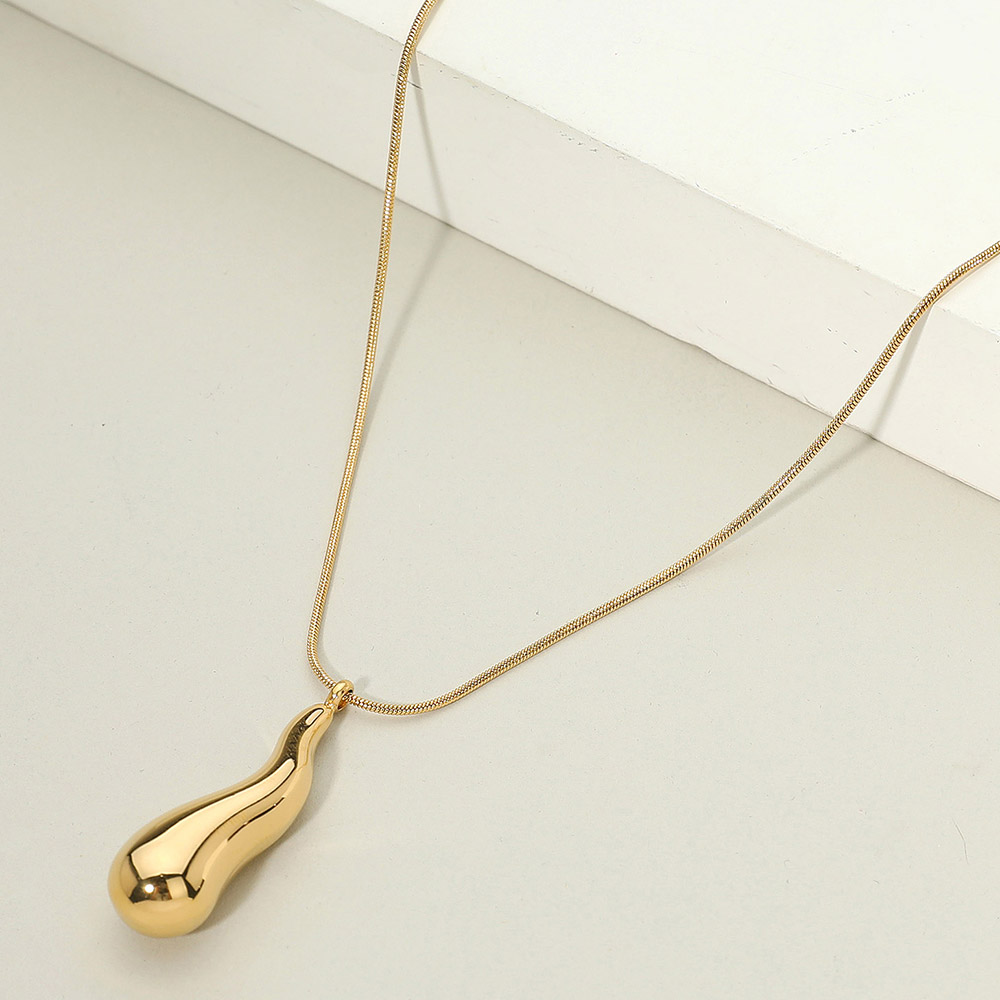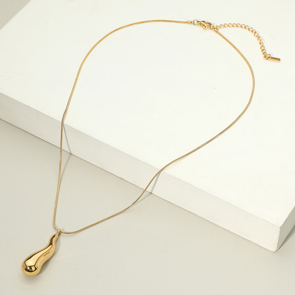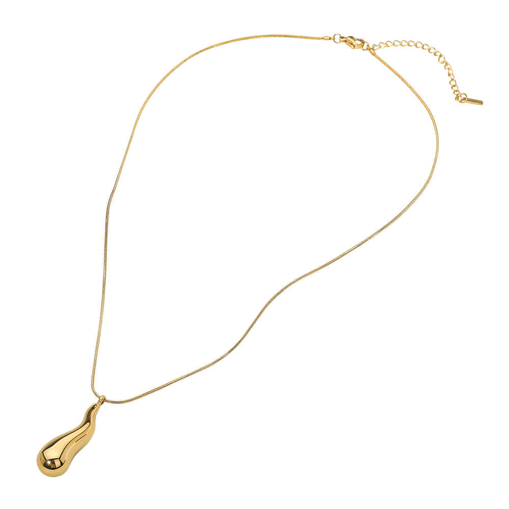 Details • Necklace Size : 16" + 2" L • Pendant Size : 0.4" X 1.4" • This stainless steel necklace features a sleek teardrop pendant with a polished finish, offering a minimalist yet striking design. Perfect for elevating both casual and dressy looks, its refined silhouette and durable build make it an elegant everyday accessory. • Gold Dipped • Stainless Steel