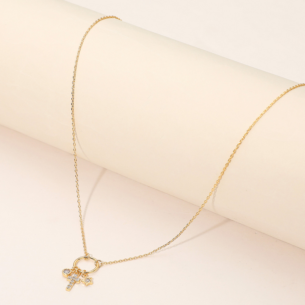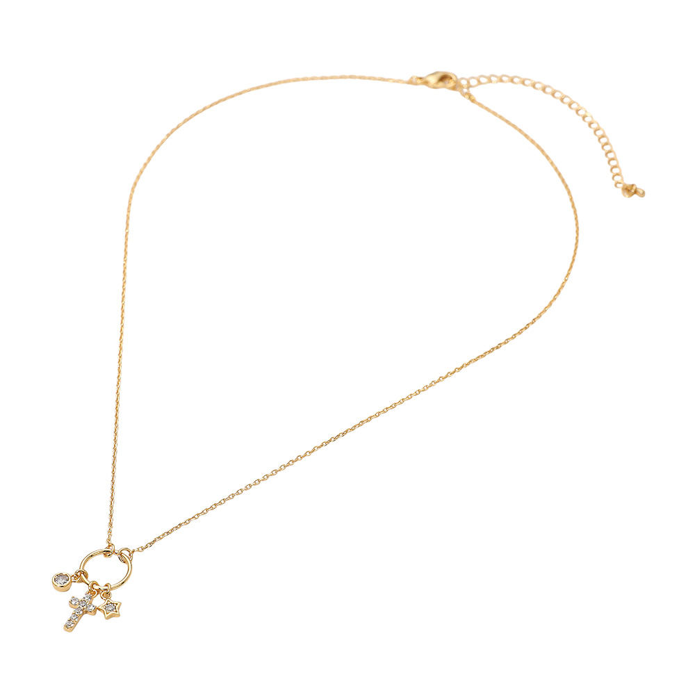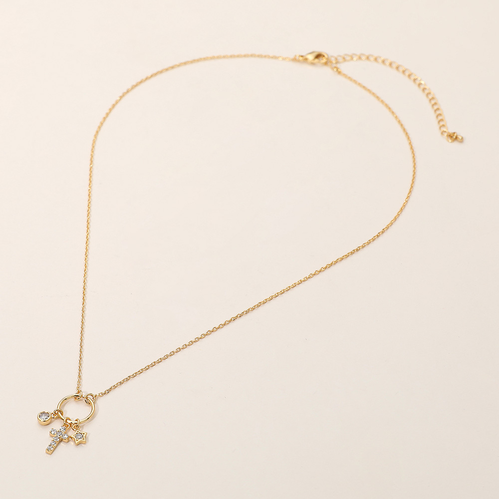 Details • Necklace Size : 16" + 3" L • Pendant Size : 0.8" L • Elegant delicate necklace featuring a fine chain with small charms including a cross, star, and gem accent. A stylish blend of faith and fashion, perfect for daily wear or layering. This minimalist design adds a subtle touch of sparkle and sophistication to any outfit effortlessly. • Gold Dipped • Lead and Nickel Compliant