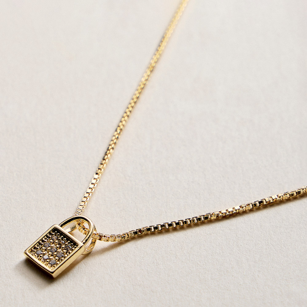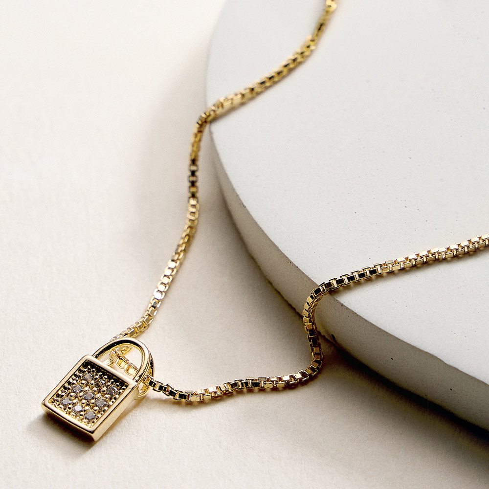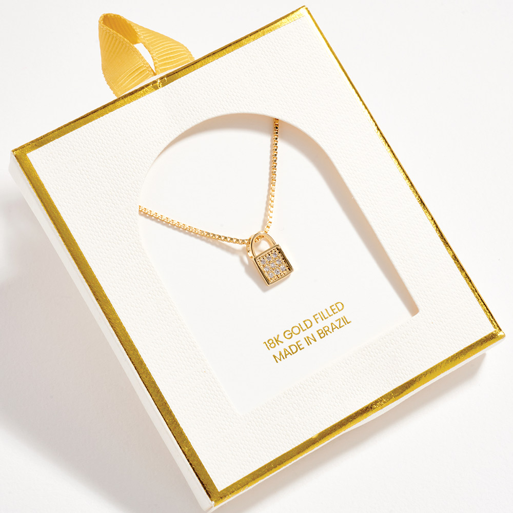 Details • Necklace Size : 18" + 1.75" L • Pendant Size : 0.25" X 0.5" • This lock charm pendant necklace offers a modern symbol of love, connection, and personal style. Designed for easy everyday wear, it works beautifully layered or worn alone as a subtle statement. A versatile jewelry piece ideal for boutiques seeking trendy, giftable pendants with meaningful charm appeal. • CZ Cubic Zirconia • Gold Filled • Hypoallergenic • Lead and Nickel Compliant • Made In Brazil