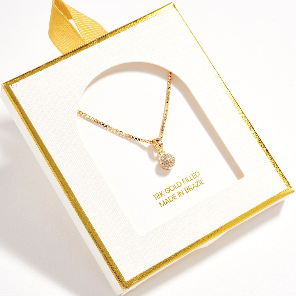 Details • Necklace Size : 18" + 1.75" L • Pendant Size : 0.25" X 0.5" • This round charm pendant necklace offers a refined, minimalist design with subtle sparkle for everyday styling. Perfect worn alone or layered, it delivers timeless appeal for casual, office, or evening looks. A versatile, gift-ready necklace ideal for boutiques seeking elegant, easy-to-style jewelry with broad customer appeal. • CZ Cubic Zirconia • Gold Filled • Hypoallergenic • Lead and Nickel Compliant • Made In Brazil