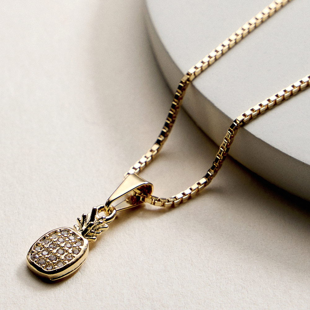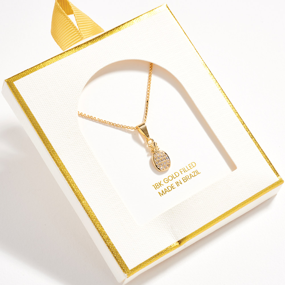 Details • Necklace Size : 18" + 1.75" L • Pendant Size : 0.25" X 0.75" • This pineapple charm pendant necklace adds a playful yet polished accent to everyday and vacation-ready looks. Designed for easy layering or standout solo wear, it brings a fun tropical vibe that pairs effortlessly with casual outfits, resort styles, and giftable jewelry collections. • Gold Filled • Hypoallergenic • Lead and Nickel Compliant • Made In Brazil