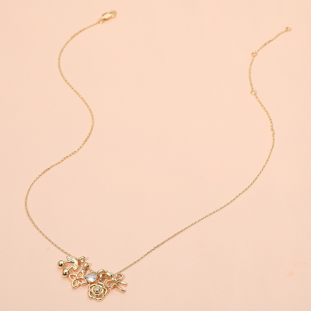 Details • Necklace Size : 15.5" + 2.5" L • Charm Size : 0.3" - 0.5" L • This charm necklace showcases a playful mix of floral, bow, and cherry motifs accented with sparkling details. A versatile piece that blends elegance with whimsy, it adds a unique touch to any outfit. Perfect for layering or wearing solo as a statement accessory. • Brass • CZ Cubic Zirconia • Lead and Nickel Compliant