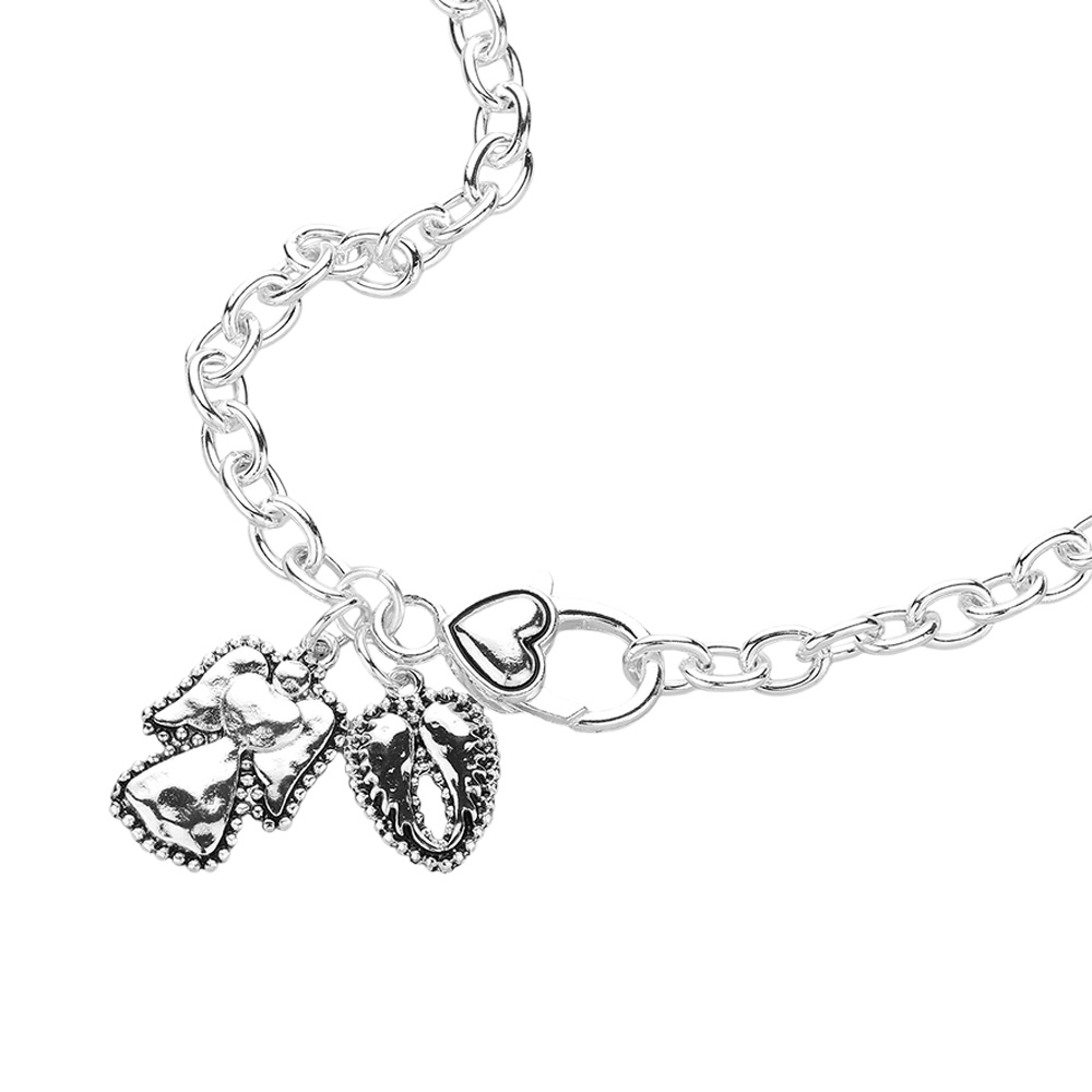 Details • Necklace Size : 17" L • Pendant Size : 0.6" X 1.25" • Bring a touch of meaning to your style with this angel and heart charm chain necklace featuring detailed pendants on a bold link chain. Complete with a heart-shaped clasp, this versatile accessory is perfect for layering or wearing solo as a standout everyday piece. • Lead and Nickel Compliant