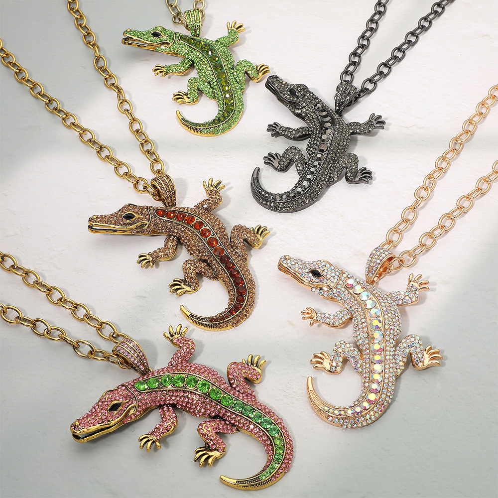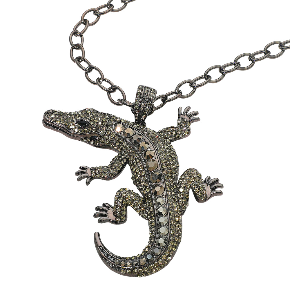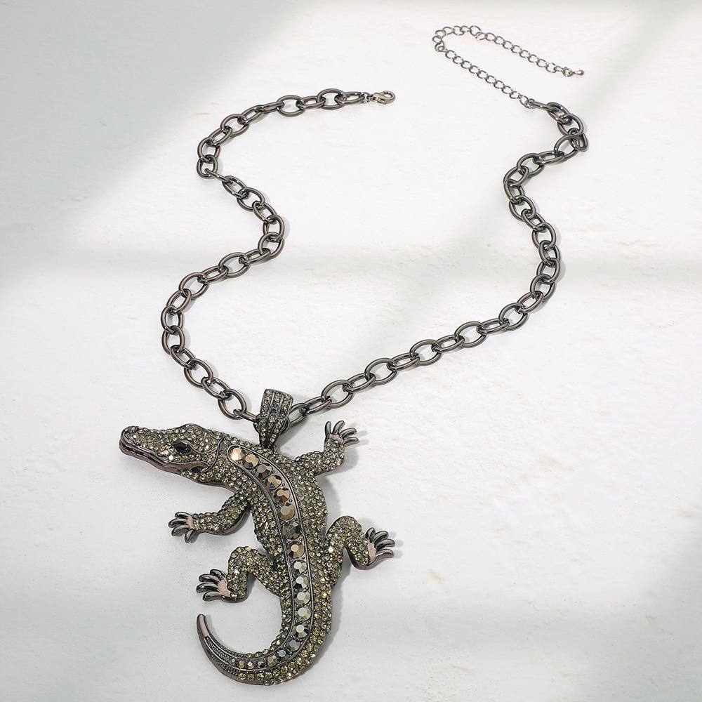 Details • Necklace Size : 22.5" + 5.5" L • Pendant Size : 3.25" X 4.25" • Bold alligator pendant necklace with shimmering accents on a chunky chain. This statement jewelry piece combines edgy charm with artistic flair, perfect for fashion-forward looks or themed events, adding a fierce and captivating touch to any stylish outfit. • Lead and Nickel Compliant