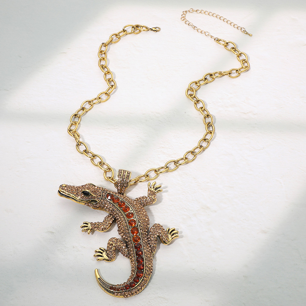• Bold alligator pendant necklace with shimmering accents on a chunky chain. This statement jewelry piece combines edgy charm with artistic flair, perfect for fashion-forward looks or themed events, adding a fierce and captivating touch to any stylish outfit.