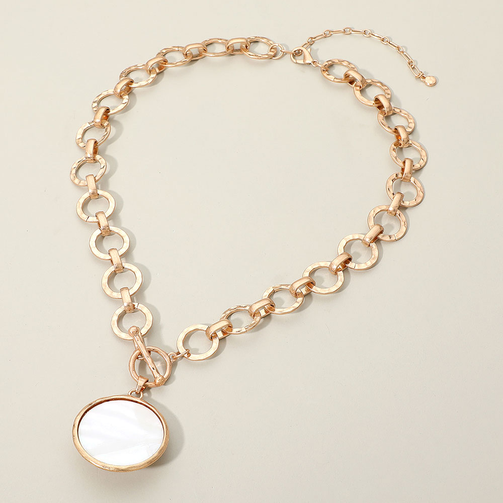 Details • Necklace Size : 18" + 3" L • Pendant Size : 1.4" X 1.4" • Toggle Closure • Add a touch of elegance to your style with this hammered link chain necklace featuring a stunning mother of pearl pendant. Designed for both sophistication and edge, this piece is ideal for evening wear or everyday glamour, making it a standout addition to any jewelry collection. • Lead and Nickel Compliant