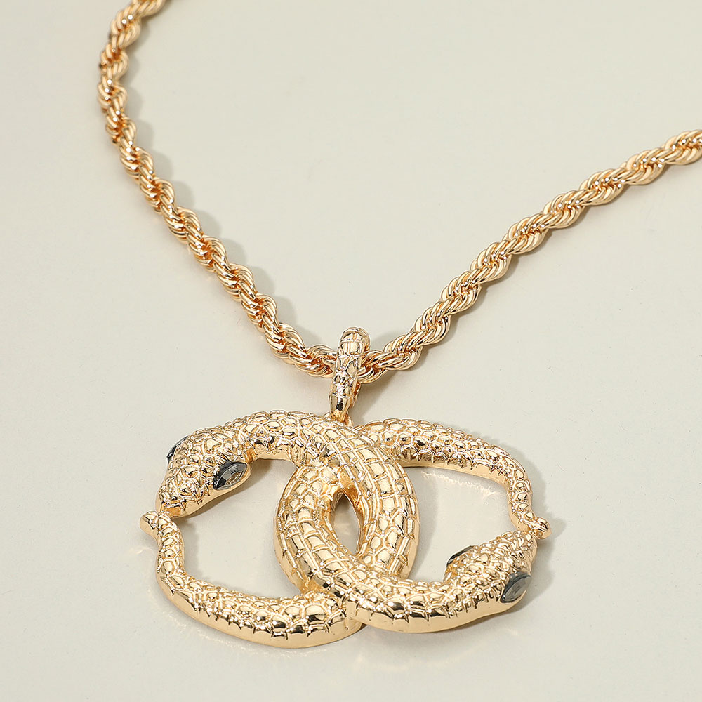 Details • Necklace Size : 18" + 3" L • Pendant Size : 2.3" X 2.2" • Command attention with this interlocking snake pendant necklace, showcasing a unique entwined design that symbolizes strength and transformation. The detailed texture and elegant chain combine to create a striking statement accessory perfect for elevating any fashion-forward look. • Lead and Nickel Compliant