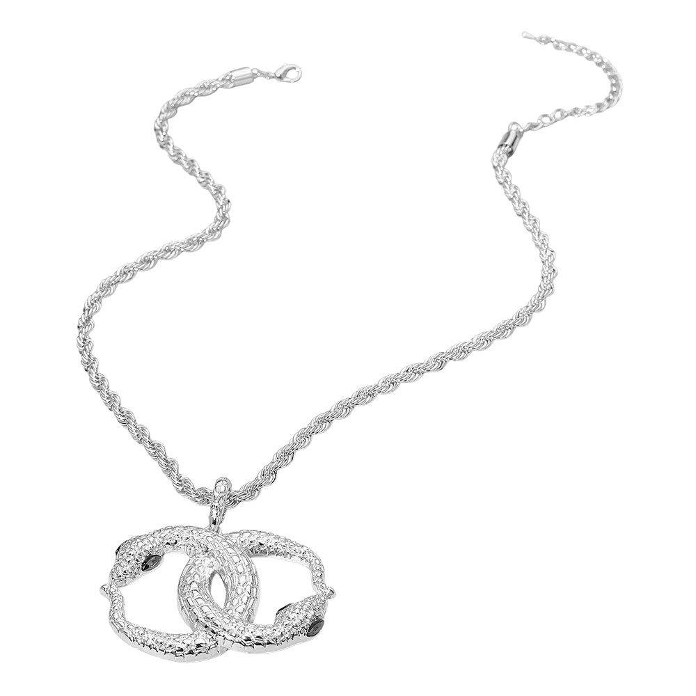 • Command attention with this interlocking snake pendant necklace, showcasing a unique entwined design that symbolizes strength and transformation. The detailed texture and elegant chain combine to create a striking statement accessory perfect for elevating any fashion-forward look.