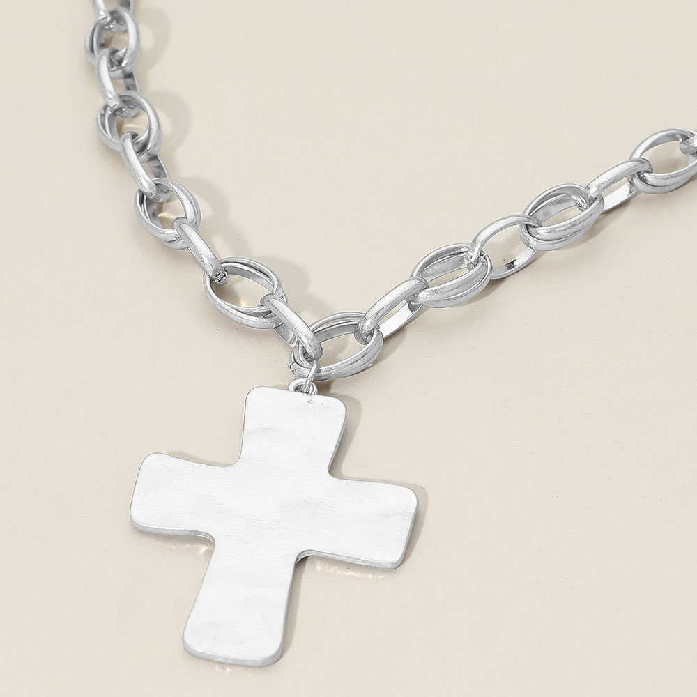 Brushed Metal Cross Pendant Chunky Chain Necklace
