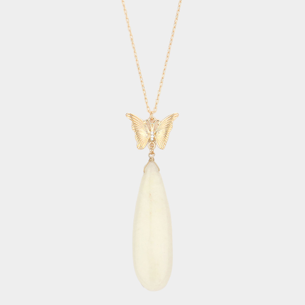 Butterfly Natural Stone Teardrop Link Pendant Long Necklace