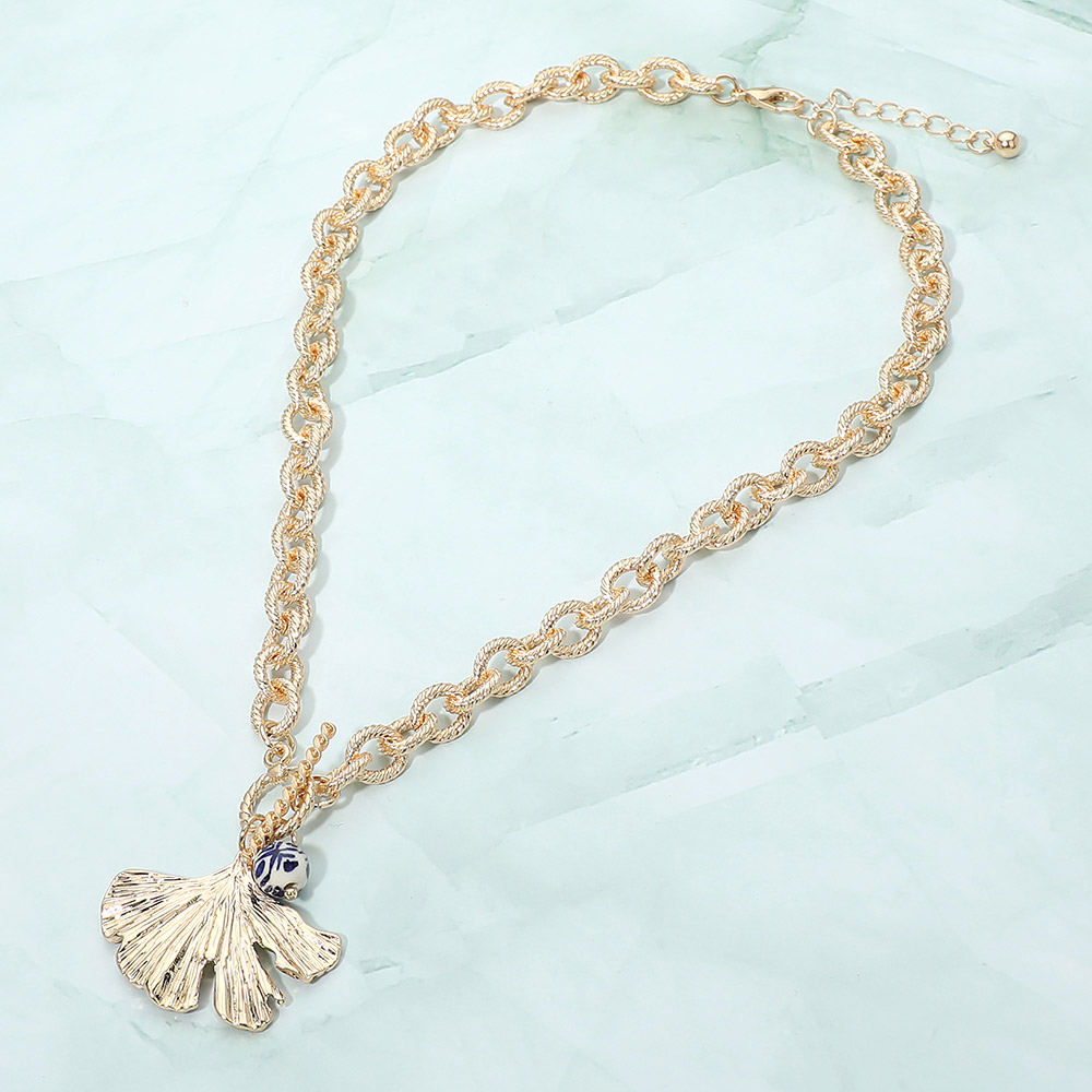 Details • Necklace Size : 17" + 1.5" L • Pendant Size : 1.5" X 1.2" • Statement necklace featuring a textured chain paired with a sculptural ginko leaf charm pendant and decorative accent bead. Designed to stand out worn alone or layered, this piece brings artistic detail and boutique appeal to everyday looks, seasonal collections, and trend-driven accessory assortments. • Lead and Nickel Compliant