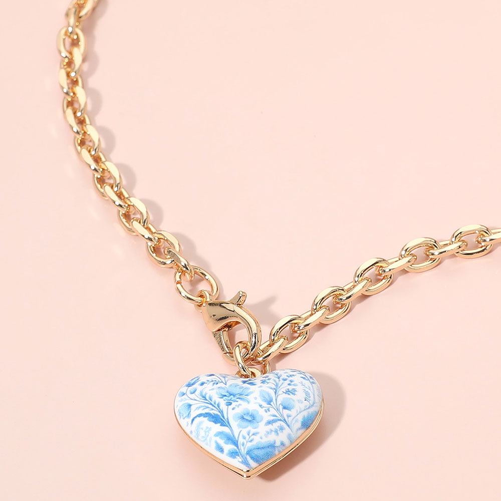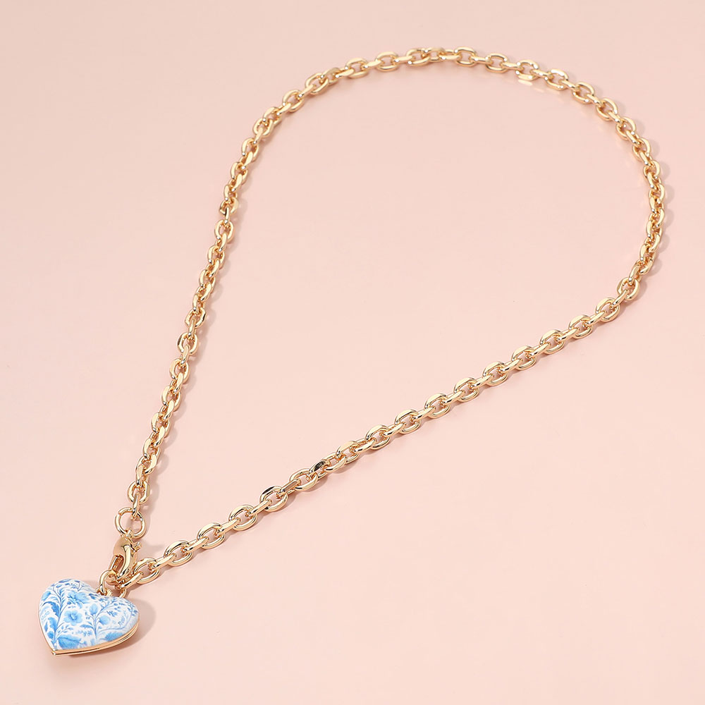 Details • Necklace Size : 18.5" L • Pendant Size : 0.8" X 0.8" • This elegant chain necklace features a delicate heart charm with a porcelain-inspired floral pattern, creating a timeless and romantic accent. Designed for effortless layering or standalone wear, it appeals to customers seeking refined, gift-ready jewelry with a soft vintage aesthetic. • Lead and Nickel Compliant