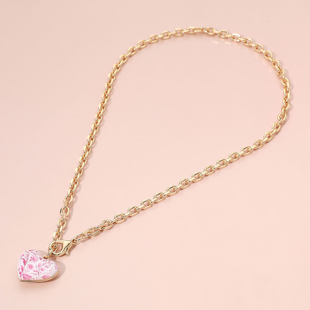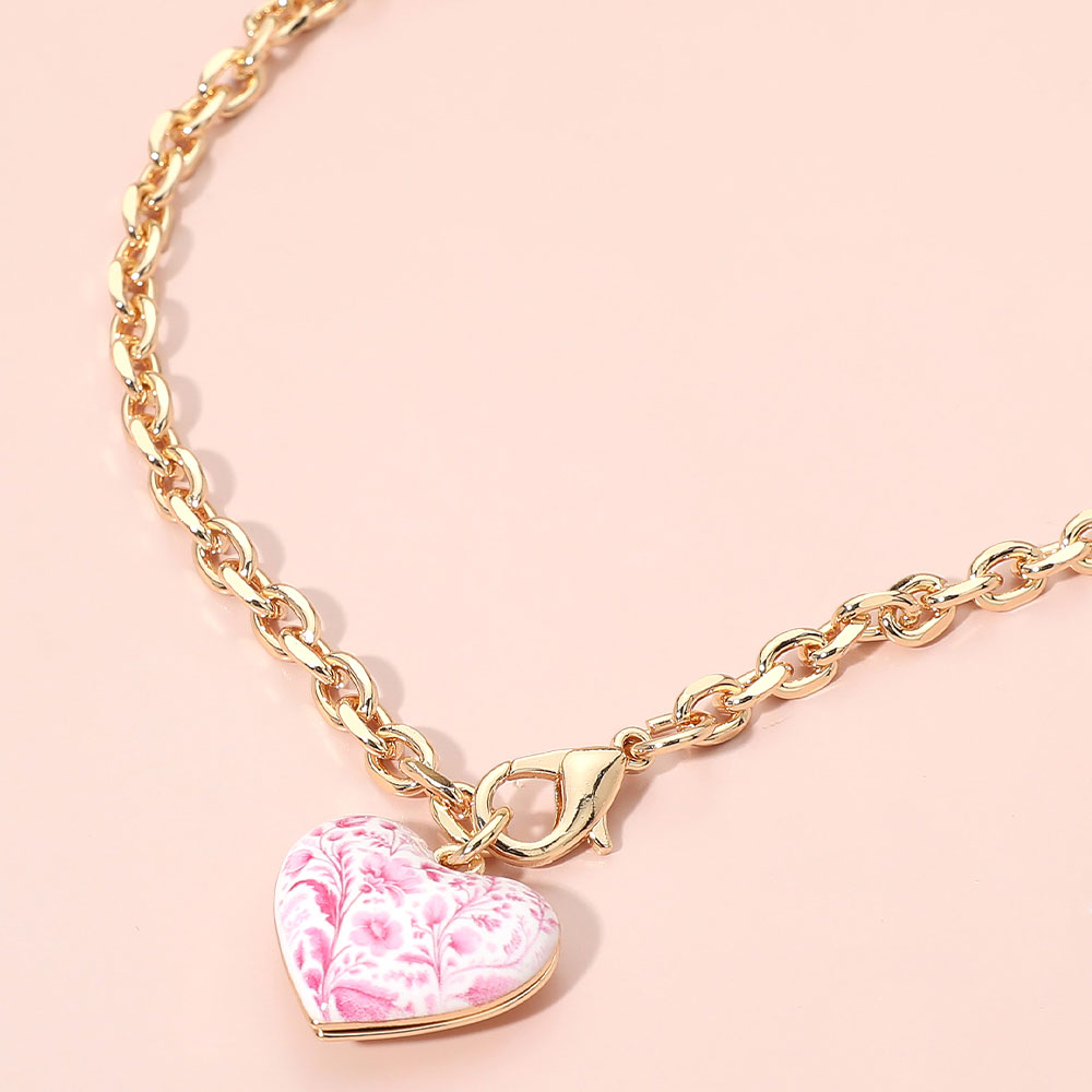 • This elegant chain necklace features a delicate heart charm with a porcelain-inspired floral pattern, creating a timeless and romantic accent. Designed for effortless layering or standalone wear, it appeals to customers seeking refined, gift-ready jewelry with a soft vintage aesthetic.