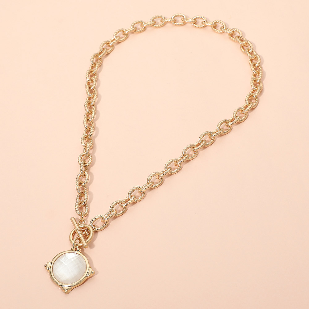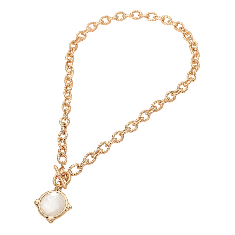 Details • Necklace Size : 18" L • Pendant Size : 1.2" X 1.2" • Elegant chain necklace featuring a round charm with subtle texture and a toggle-style closure. Designed for easy styling, this versatile piece adds a refined statement to casual or elevated looks and layers effortlessly with other necklaces for a modern, curated finish. • Lead and Nickel Compliant