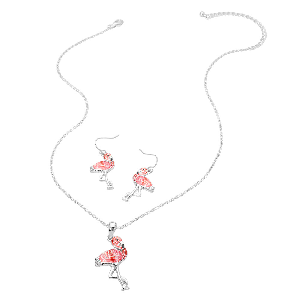 Details • Necklace Size : 18" + 3" L • Pendant Size : 0.8" X 1.75" • Earrings Size : 1.5" L • Made in Vietnam • Flamingo pendant necklace and matching earring set designed with a playful tropical motif that adds charm and personality to any outfit. Perfect for beach boutiques, resort shops, summer collections, and gift displays. This coordinated jewelry set appeals to customers who love fun statement accessories, vacation inspired styles, and cheerful animal themed designs. • Lead and Nickel Compliant